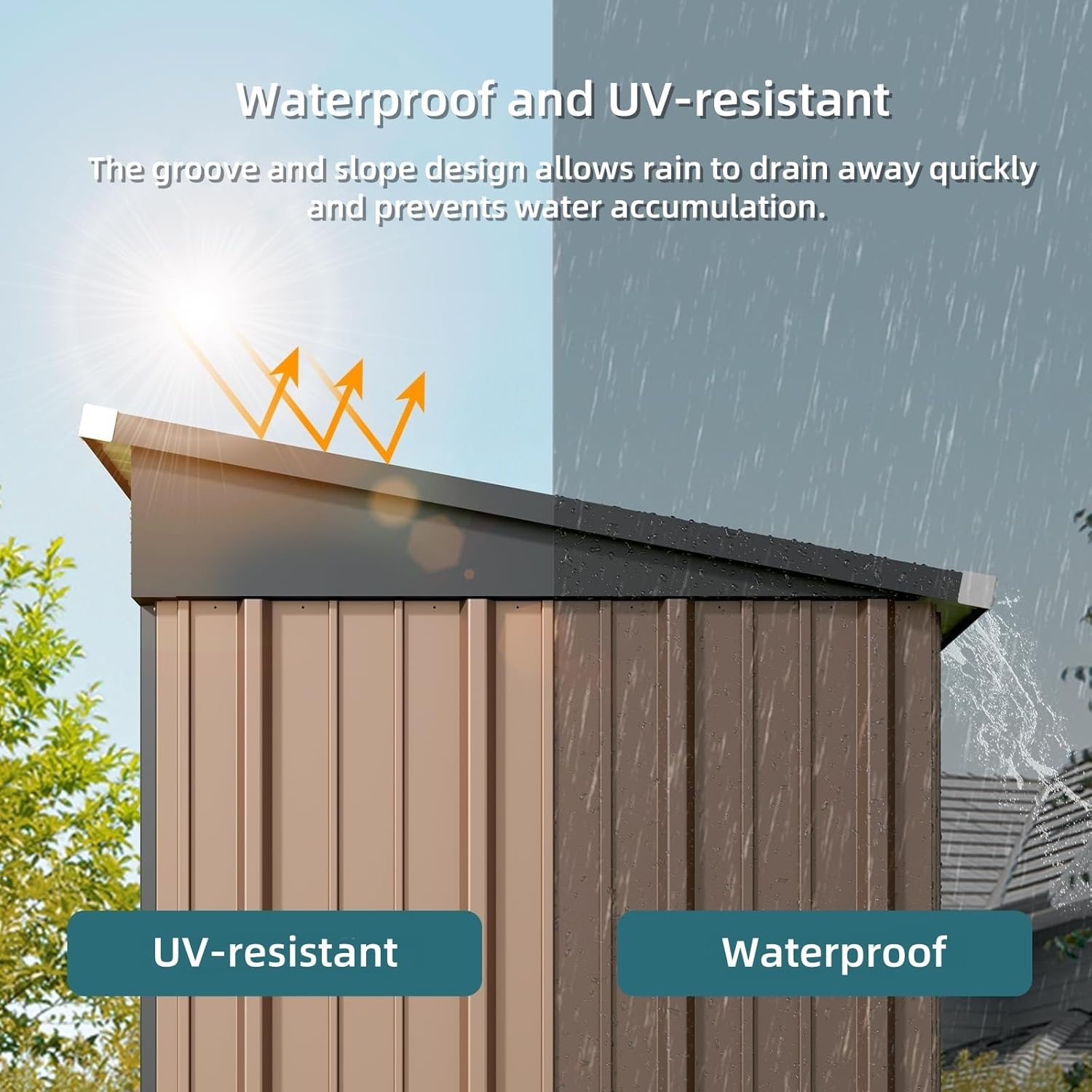 - 【Durable & Sturdy Design】Our outdoor storage cabinet is built to withstand the elements. The sloped, grooved roof prevents water from pooling, keeping your tools dry even in heavy rain. Thoughtful safety features like anti-collision and screw protection make this backyard storage shed ideal for family backyards.