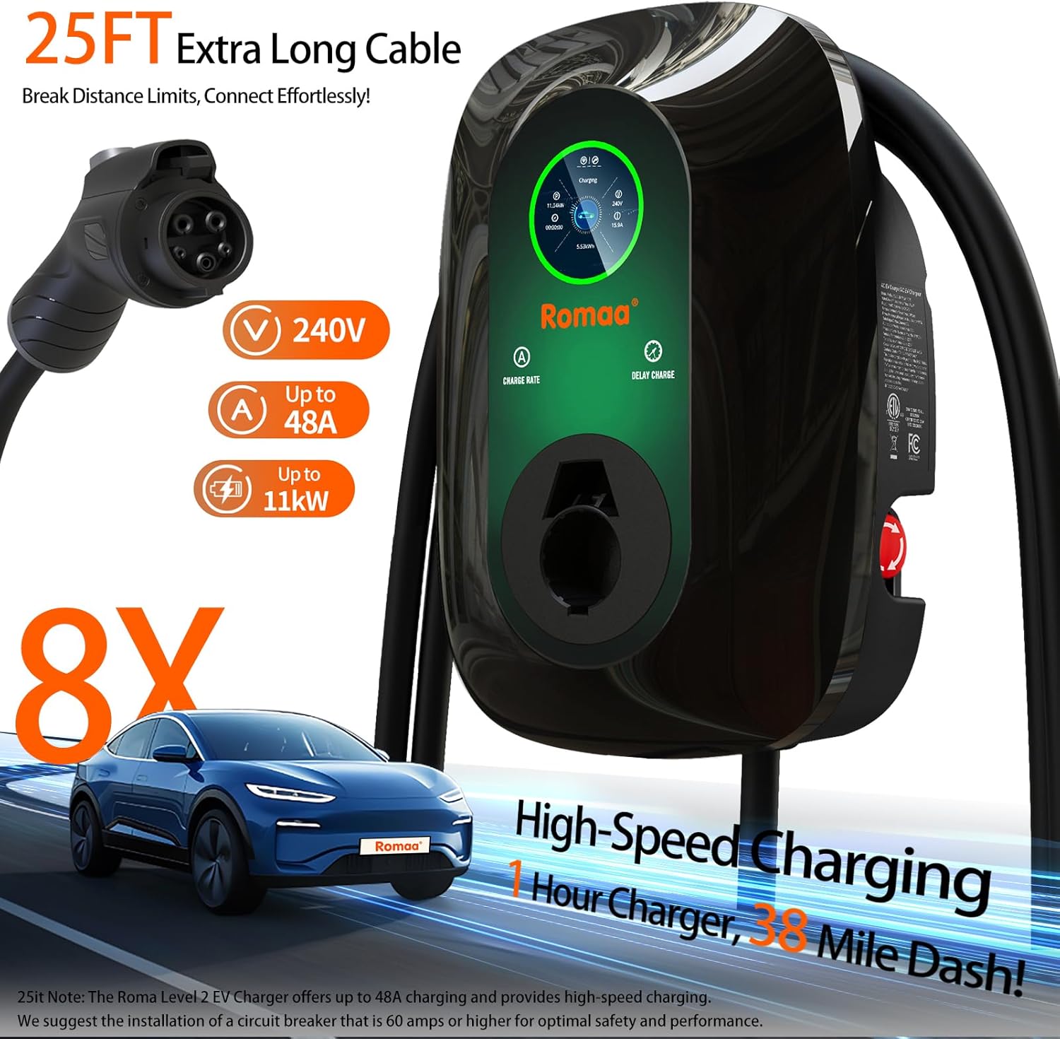 - Supports up to 11kWh High-speed Charging: Easily adjust the amperage from 24A to 48A using the screen button or APP for a customized charging experience; Provides a maximum output of 48A when connected to a 60A circuit breaker (installation should be performed by a licensed electrician), 40A for a 50A breaker, and 32A for a 40A breaker, ensuring optimal performance and compatibility with various electrical setups