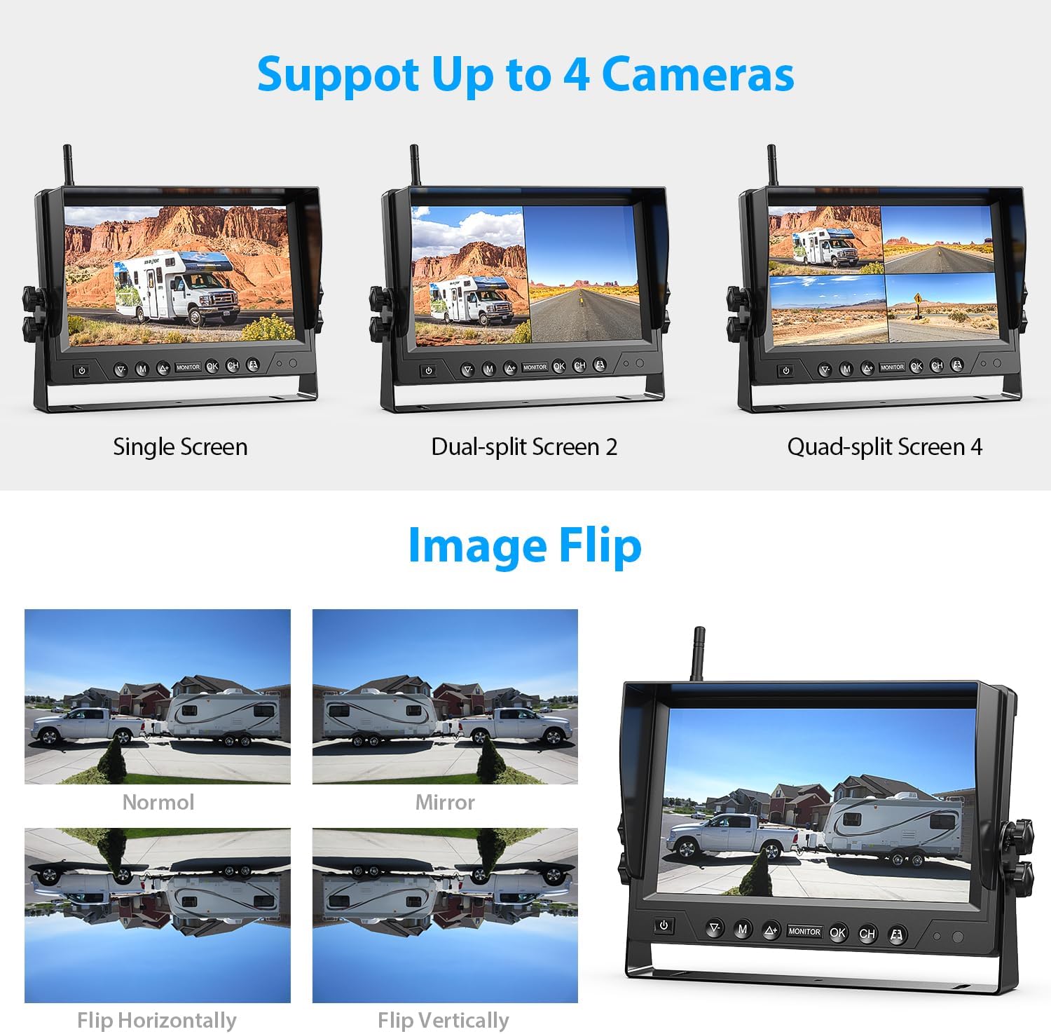 - 9" HD1080P Monitor with Quad-split Screen: The large 9-inch screen can display images in HD 1080P resolution with a clearer detail view. The rv backup camera system supports up to 4 cameras, which could be setup for dual/quad screen for multiple cameras monitoring at the same time. The system comes with 4 rear/front view cameras, if you need to add more cameras, please contact us to purchase separately. With the DVR loop recording, the system will automatically overwrites the old footages.