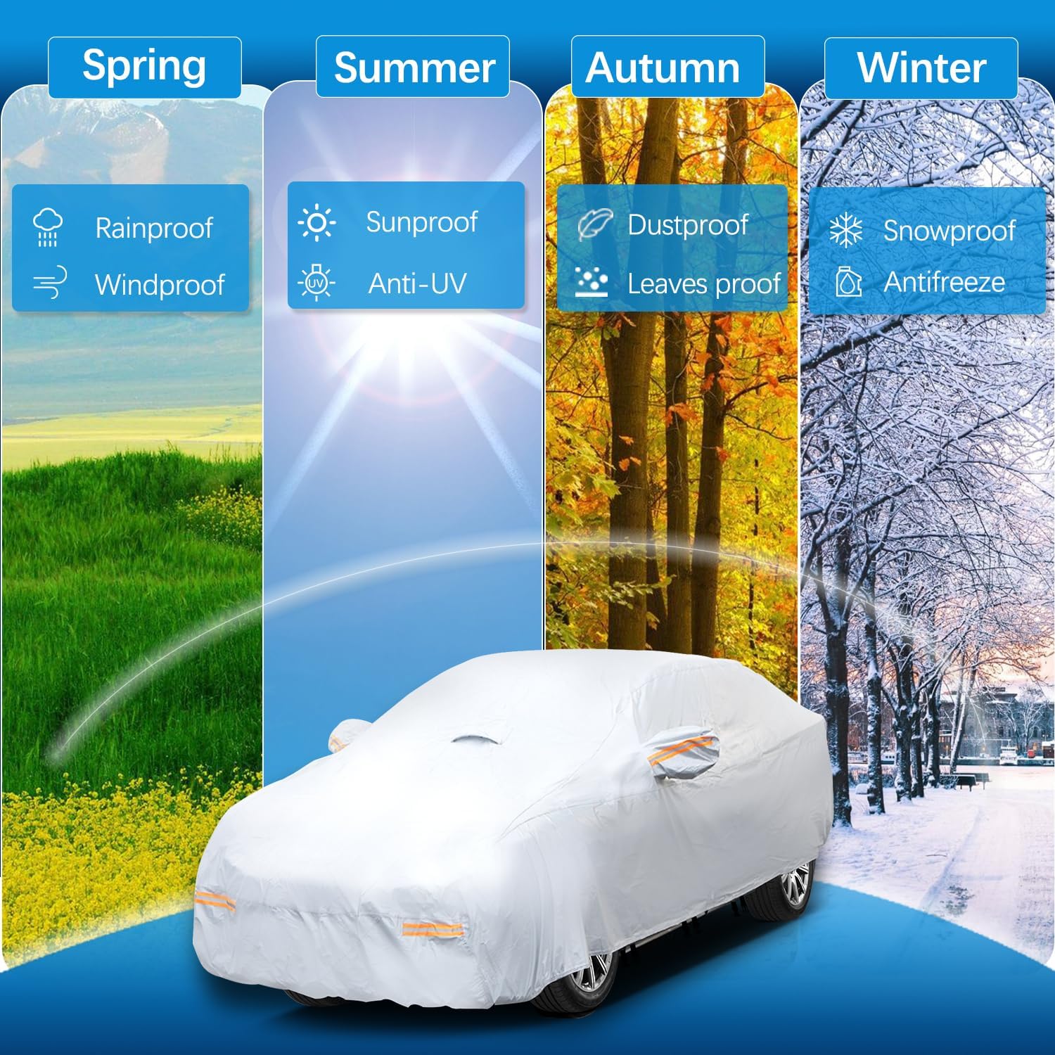 - 【Upgraded Heavy-Duty Material】OWEEIO car cover is made of new upgraded heavy-duty material, which dramatically improves the durability and tear resistance compared to standard all-weather car covers, ensuring strong protection against rain, snow, UV rays, dust and scratches when used indoors or outdoors.