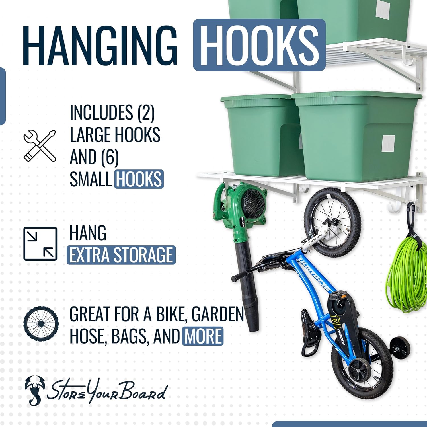 - INCLUDES STORAGE HOOKS – Comes with 2 large and 4 small garage hooks for added hanging storage under each wire shelf. Use the hooks for cords, garden tools, bags, or garage wall organizer systems. Maximize vertical space while keeping frequently used tools within reach.