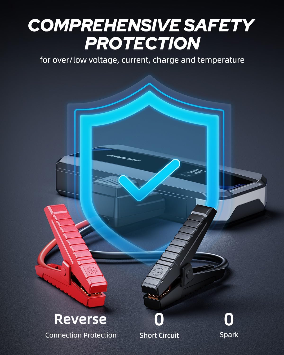 - 【Escort Your Safety while Jump Start】-The portable jump box for car battery is built-in multifunctional safety protection system including spark-proof, reverse polarity, short circuit, high-temperature, overcharge protection, etc. And with smart clamps design, jump pack without worrying about incorrect connections or sparks even if you're a novice. Wide application for 12v vehicles like motorcycles, pickups, RVs, tractors, trucks, vans, ATVs, snowmobiles, yachts, and more