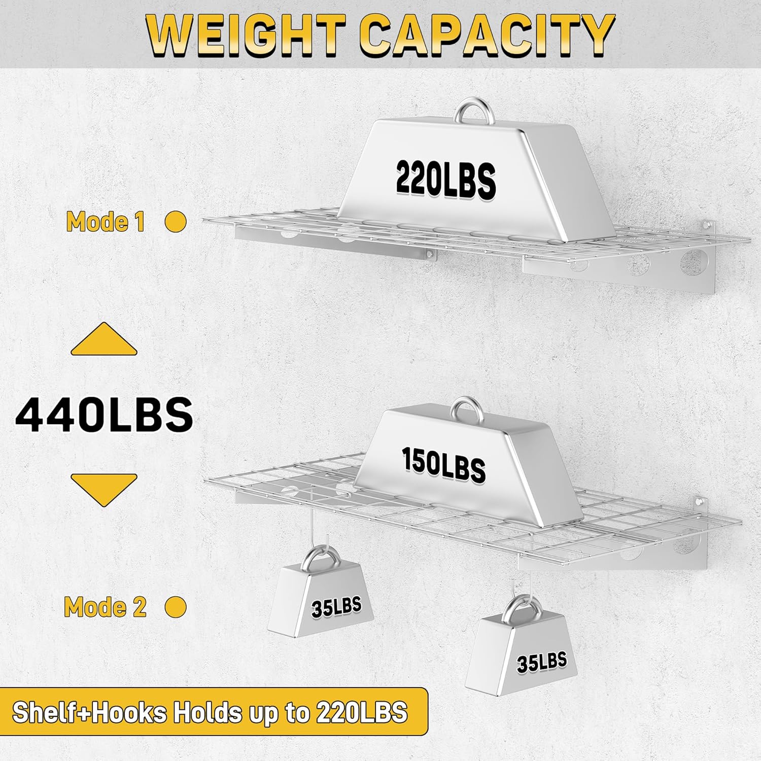 - Strength & Endurance: Crafted from resilient heavy-duty steel, the garage wall shelves are built to endure. With a powerful weight capacity of 220 lbs per shelf, it stands strong to support your heavy items, while its rust-resistant powder coating preserves its strength