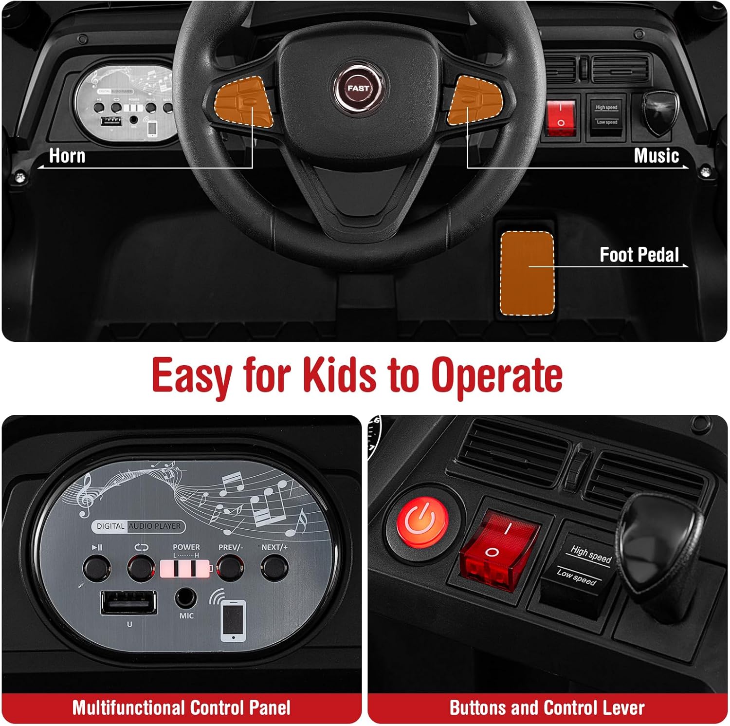 - 【Multifunctional Control Panel】 Boasting a built-in horn and music, this ride on UTV provides children with entertainment while driving. The wireless connection, USB and MIC ports connect external devices for more fun, while the LED lights add to the excitement, making every ride an adventure.