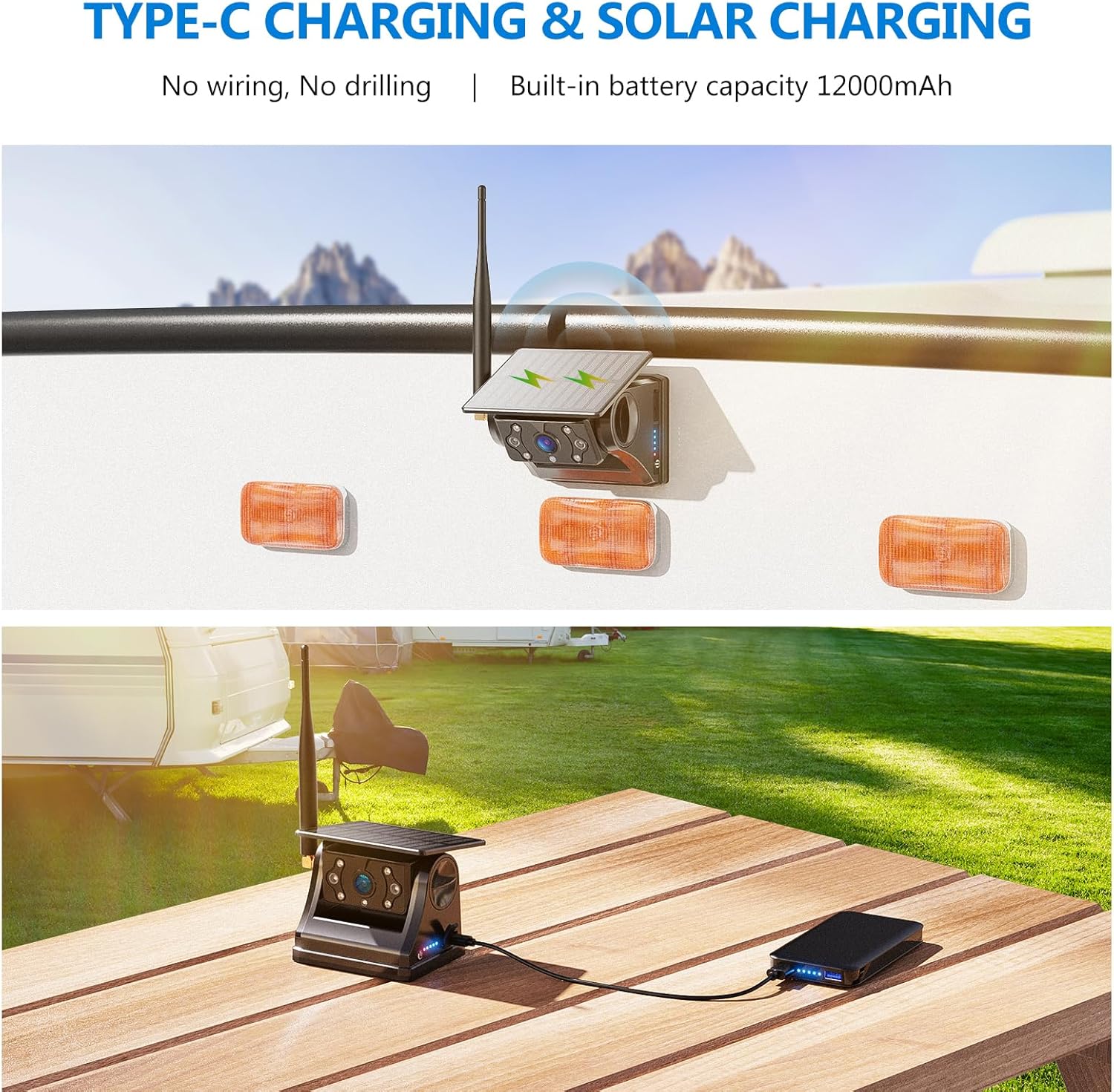 - Rechargeable Portable Camera: Equipped with an upgraded 12000mAh battery, this camera supports two charging methods: Type-C & solar charging. Stay charged during sunny drives! The IP69 waterproof rating ensures long-lasting performance, even in harsh weather conditions.