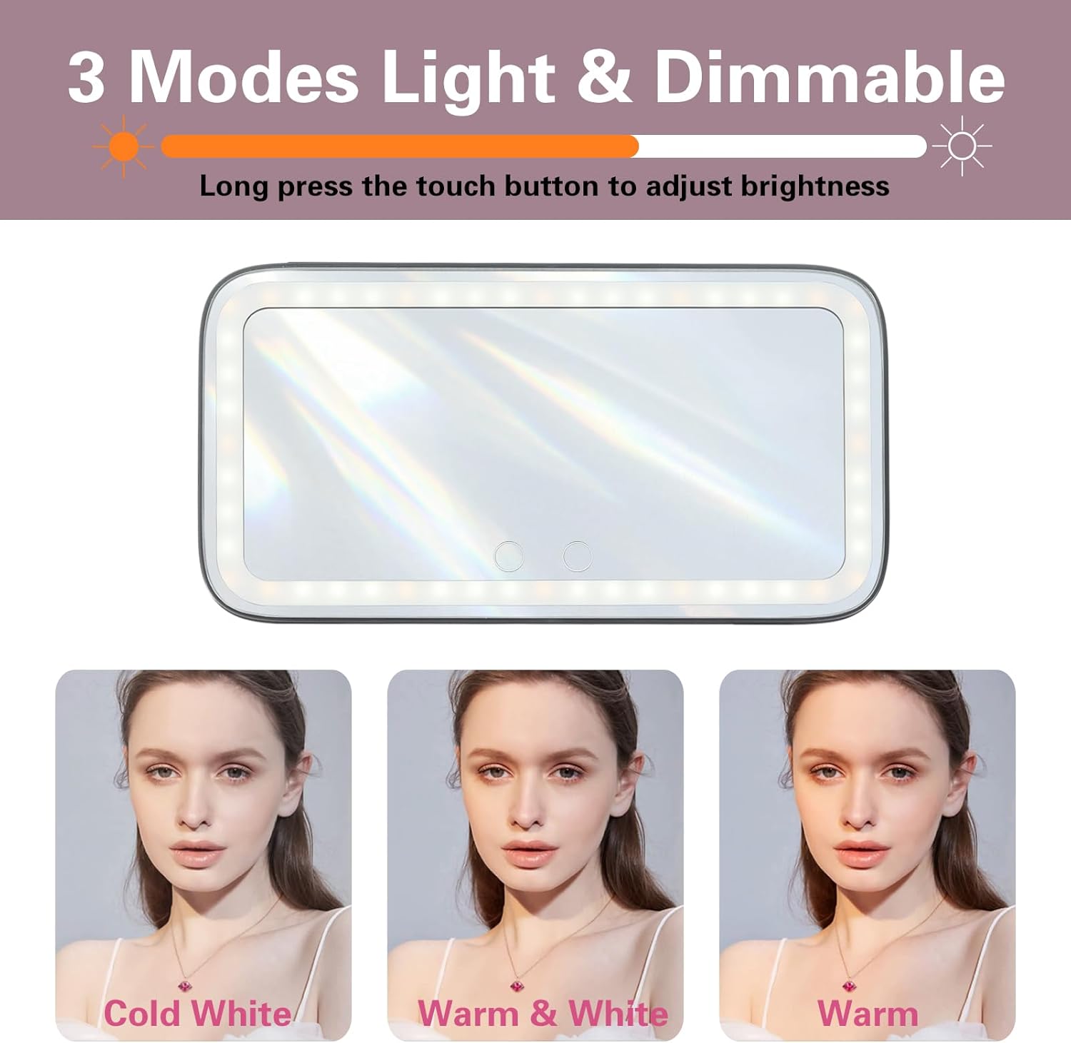 - 3 Modes Light & Dimmable: Led car mirror has white lights and yellow lights, short press the two sensor switches to switch between three light colors: white, yellow, white and yellow. And when you press and hold it still, you can adjust the light brightness.