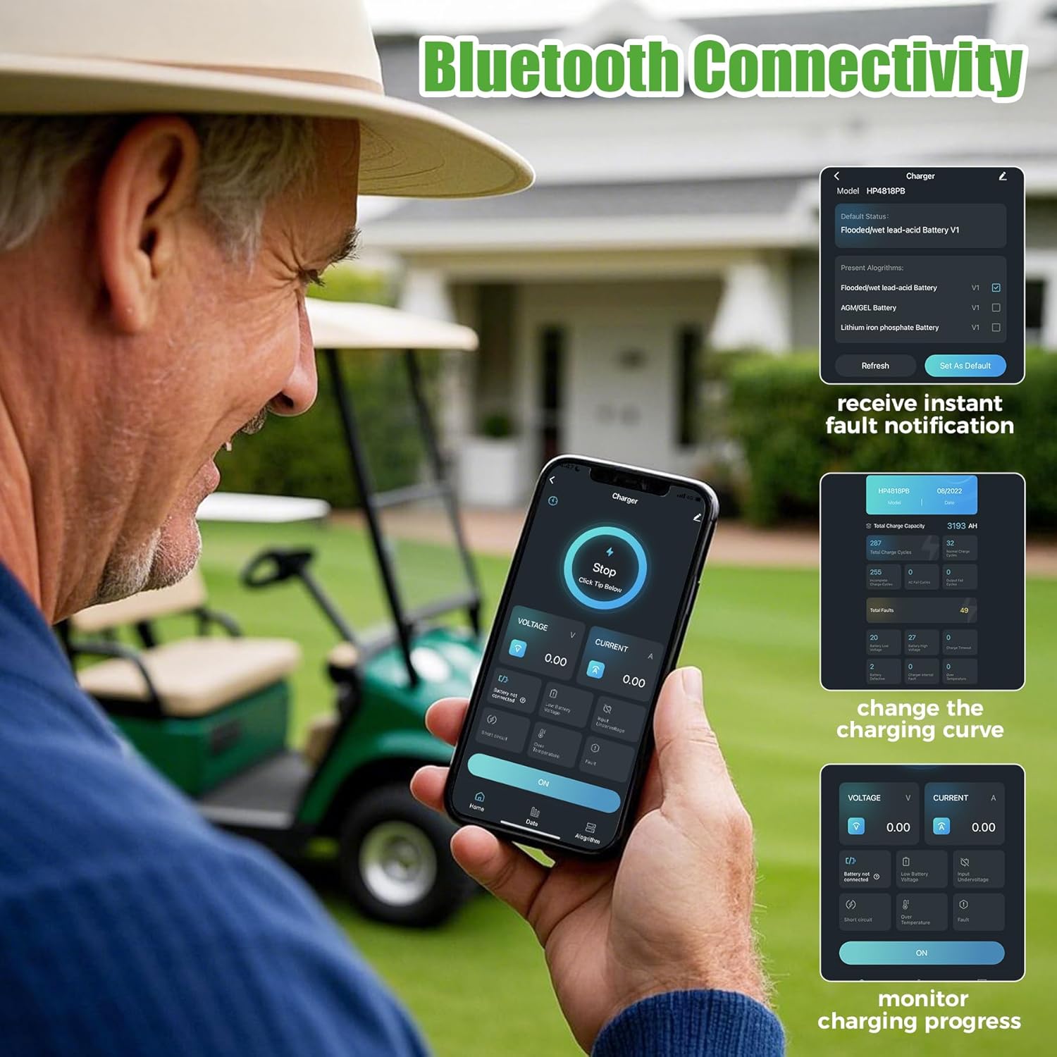 - Advanced Automatic Recharge Feature: Automatically recharges the battery if voltage drops below 48V after 7 days of being connected to AC power, our golf cart charger can keeping it fully charged and preventing damage from neglect.