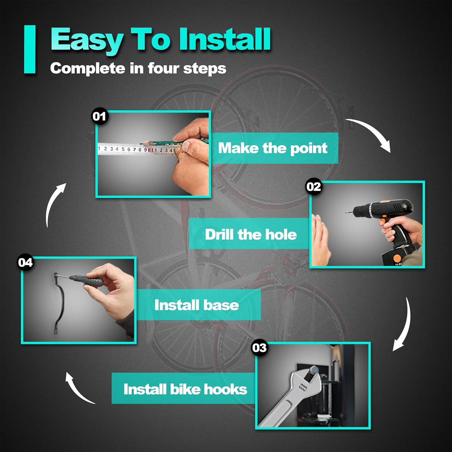 - [Versatile Bike Compatibility] bike rack garage can support storing various styles of bikes, such as road bikes, mountain bikes, e-bikes, kids' bikes, etc. bicycle wall mount fits bicycle tires up to 2.6 inches wide and 29 inches in diameter. bike hangers for garage each can hang weight of up to 30 kg/66.2 lbs.