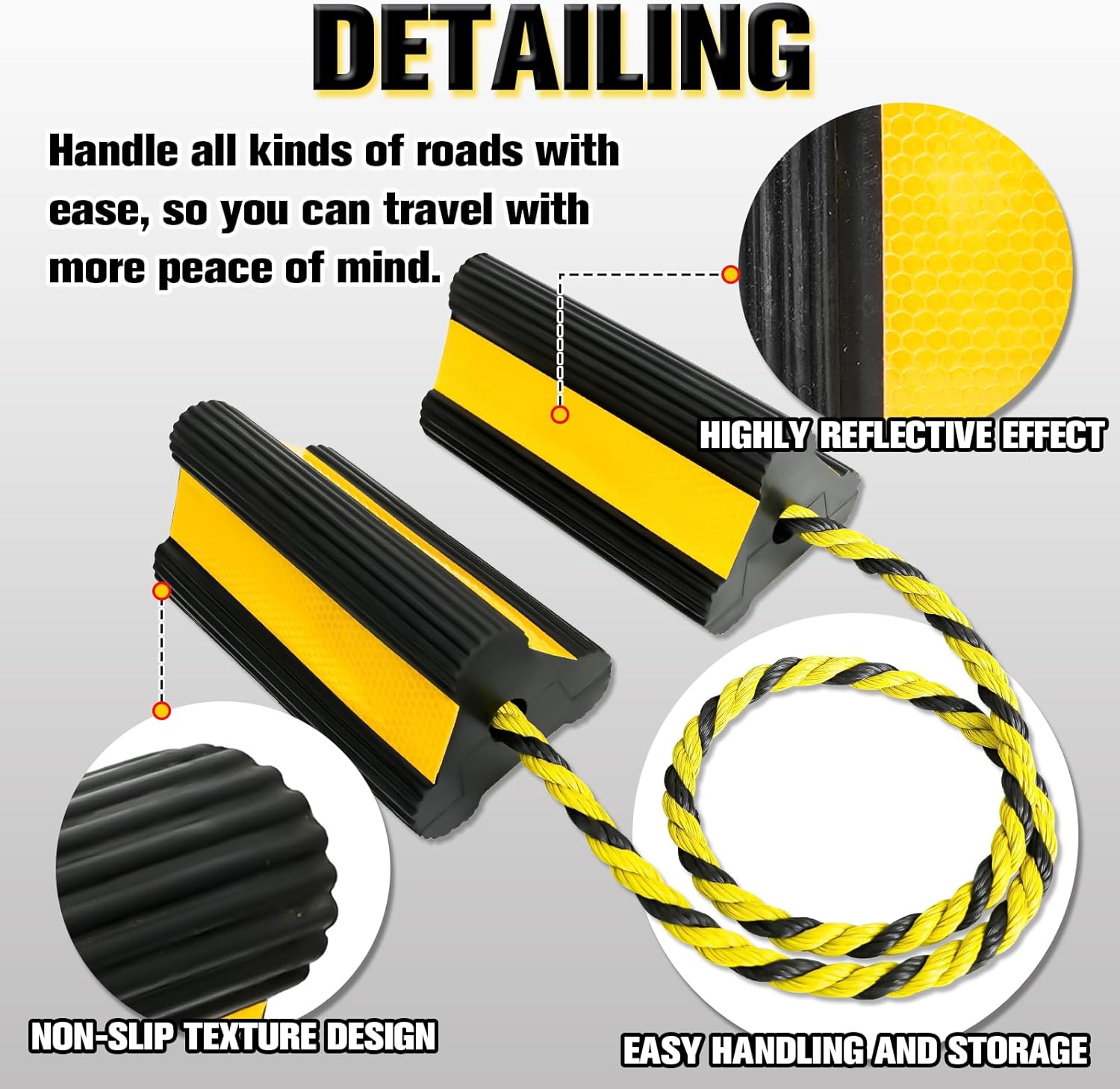 Heavy-Duty Wheel Chocks with Extra-Long Safety Rope (86") - 2-Pack Reflective Rubber Blocks for Trailers, Trucks, Campers & Garage Use (2pair/4pack with Rope)
