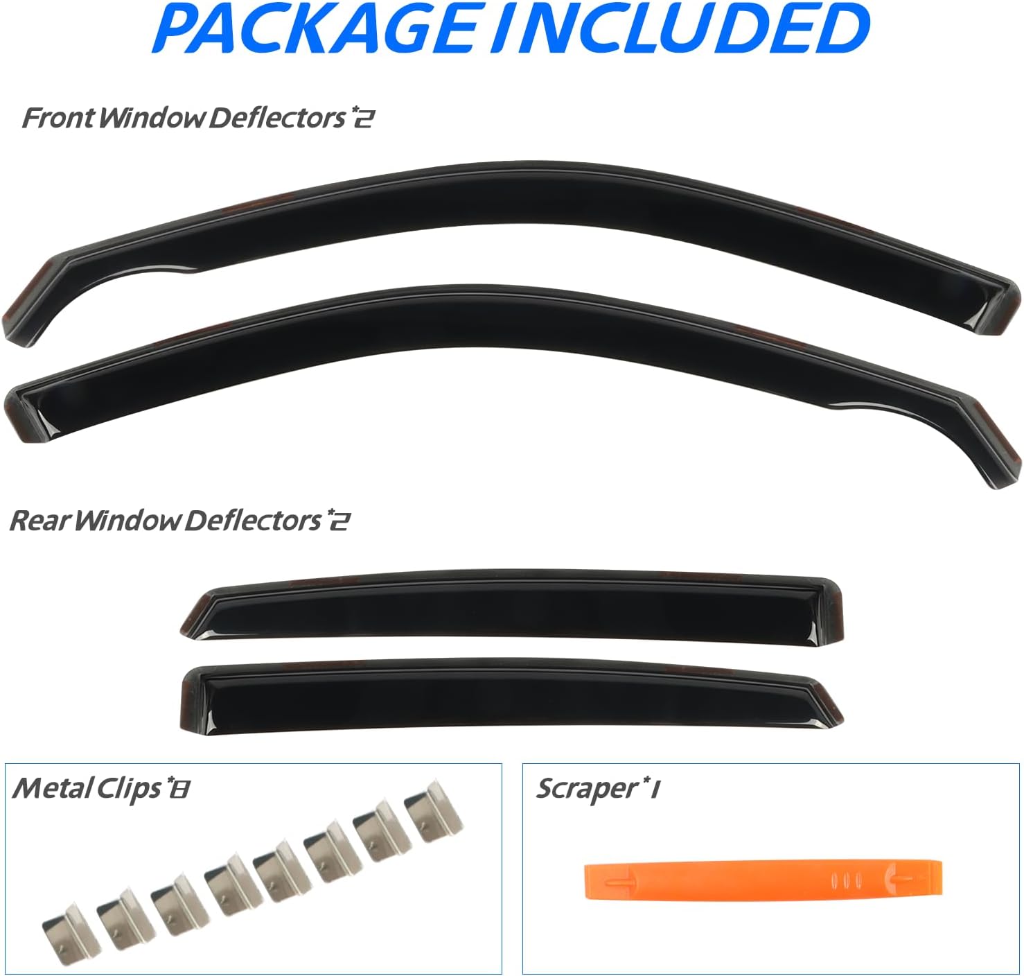 - 【Easy Installation】 Come with 4 pcs FULL-SIZE side window deflectors, 8 pcs clips, 1 pcs plastic Crowbar for a durable and secure installation. No complicated instructions are needed. Attention: Please apply the clip to fix the rain guards