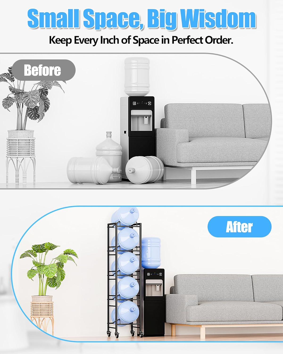 - Space saving: Our water jug rack adopts vertical space design cleverly, making the 5 gal water jug not take up too much of the ground. You can stack five 5 gallon jugs neatly at once, keeping your space neat and organized and saving a lot of space.