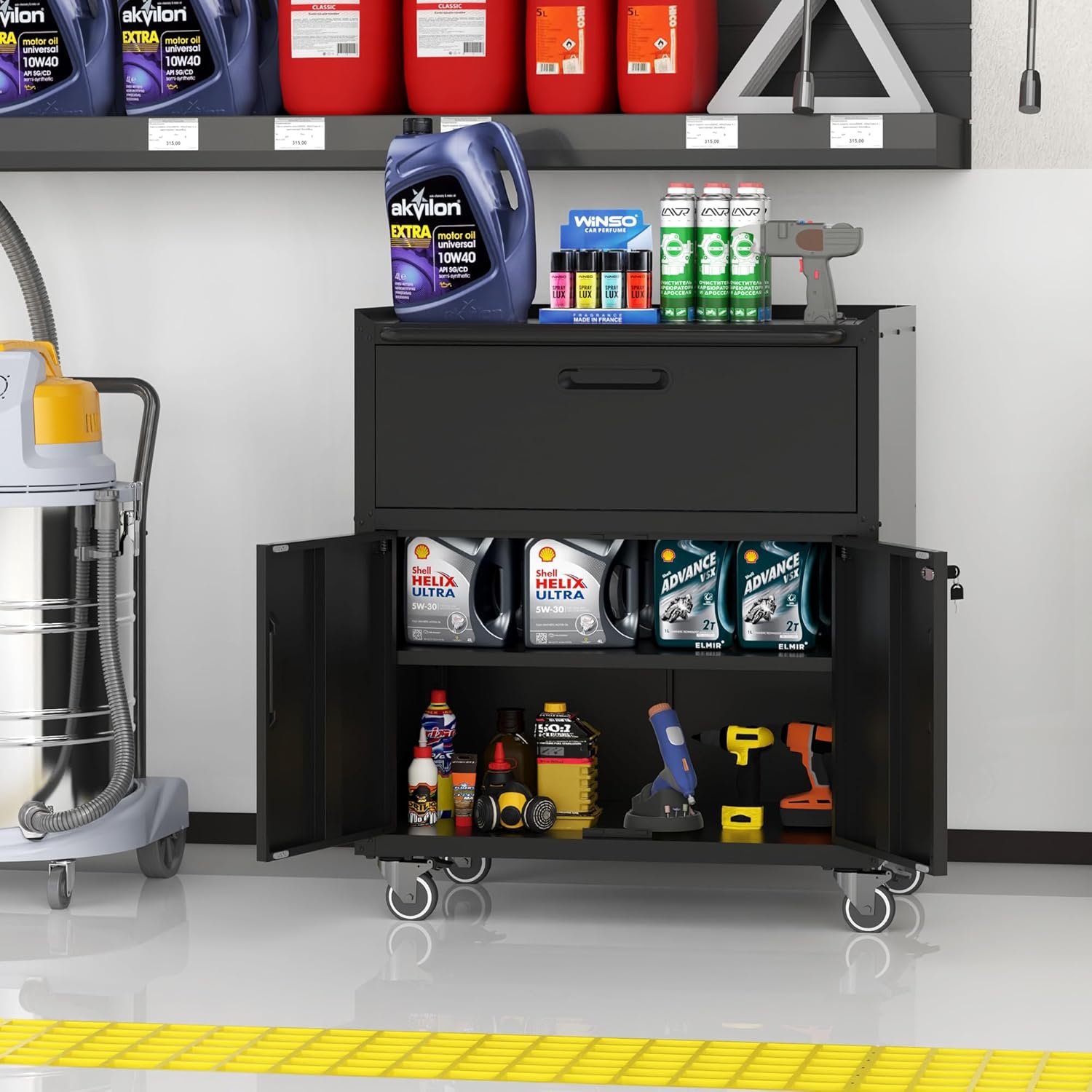 Metal Storage Cabinet with Wheels, Lockable Garage Cabinet with 2 Doors and 1 Drawer, Rolling Tool Storage, Assembly Required, Black