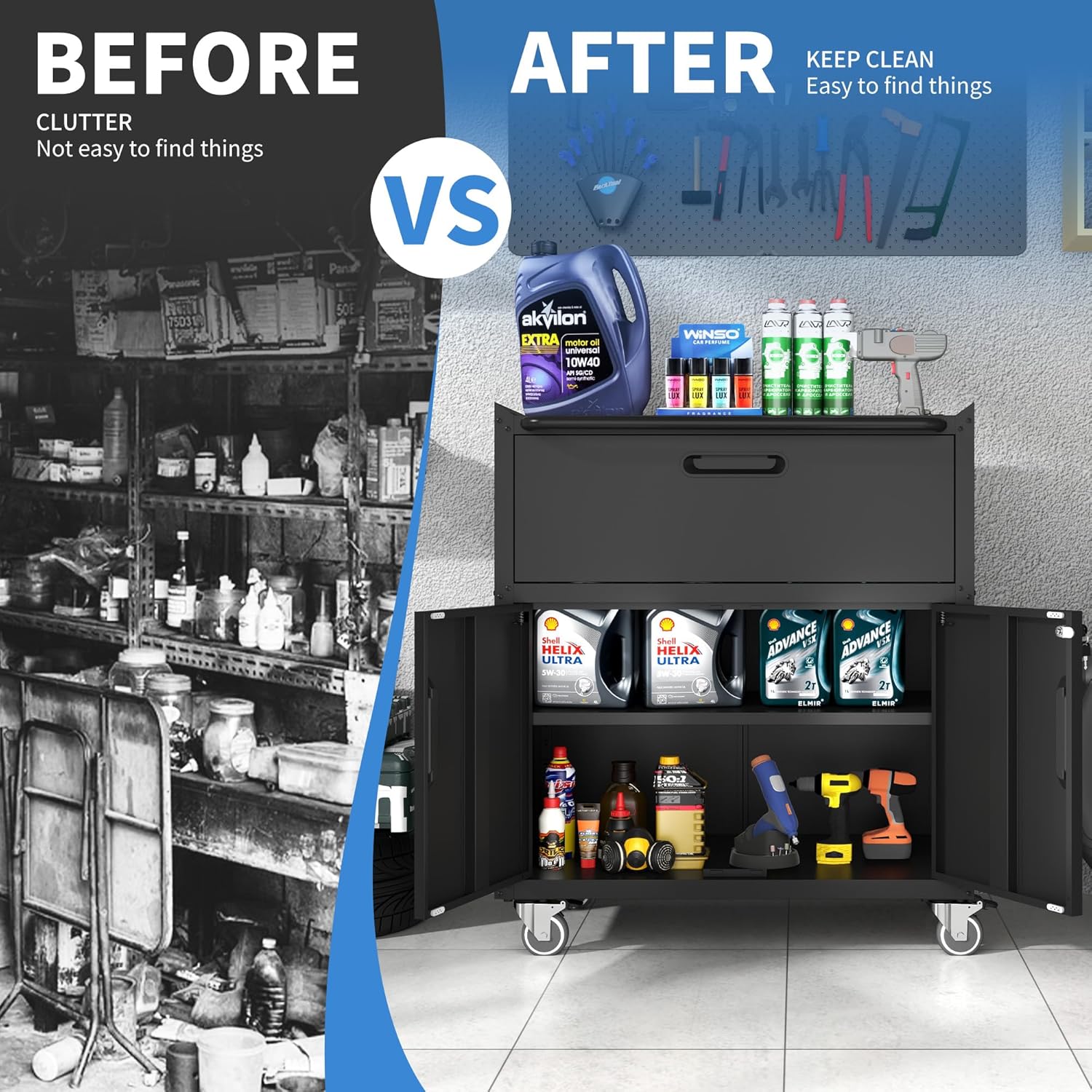 - STURDY & DURABLE: This storage cabinet with wheels is made of high-quality steel plate which is processed and assembled to be strong and stable, with high load-bearing capacity, suitable for storing heavy tools and equipment. Meanwhile, the cabinet is made with anti-rust process to ensure that it will not rust for a long time.