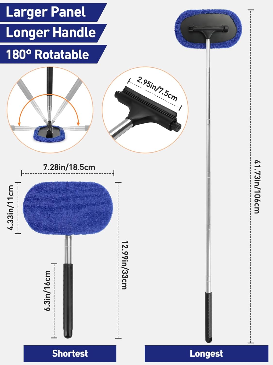 - 【Ergonomic design】 Our windshield cleaner with special extension pole design,you can easily remove fog and water from the windshield with one hand while sitting inside the car. It also easily reaches difficult-to-wash areas like the roof and undercarriage,no need to bend over. This expands the cleaning range, greatly shortening the car cleaning time. This windshield wipers effortlessly handles both interior and exterior cleaning car for you!