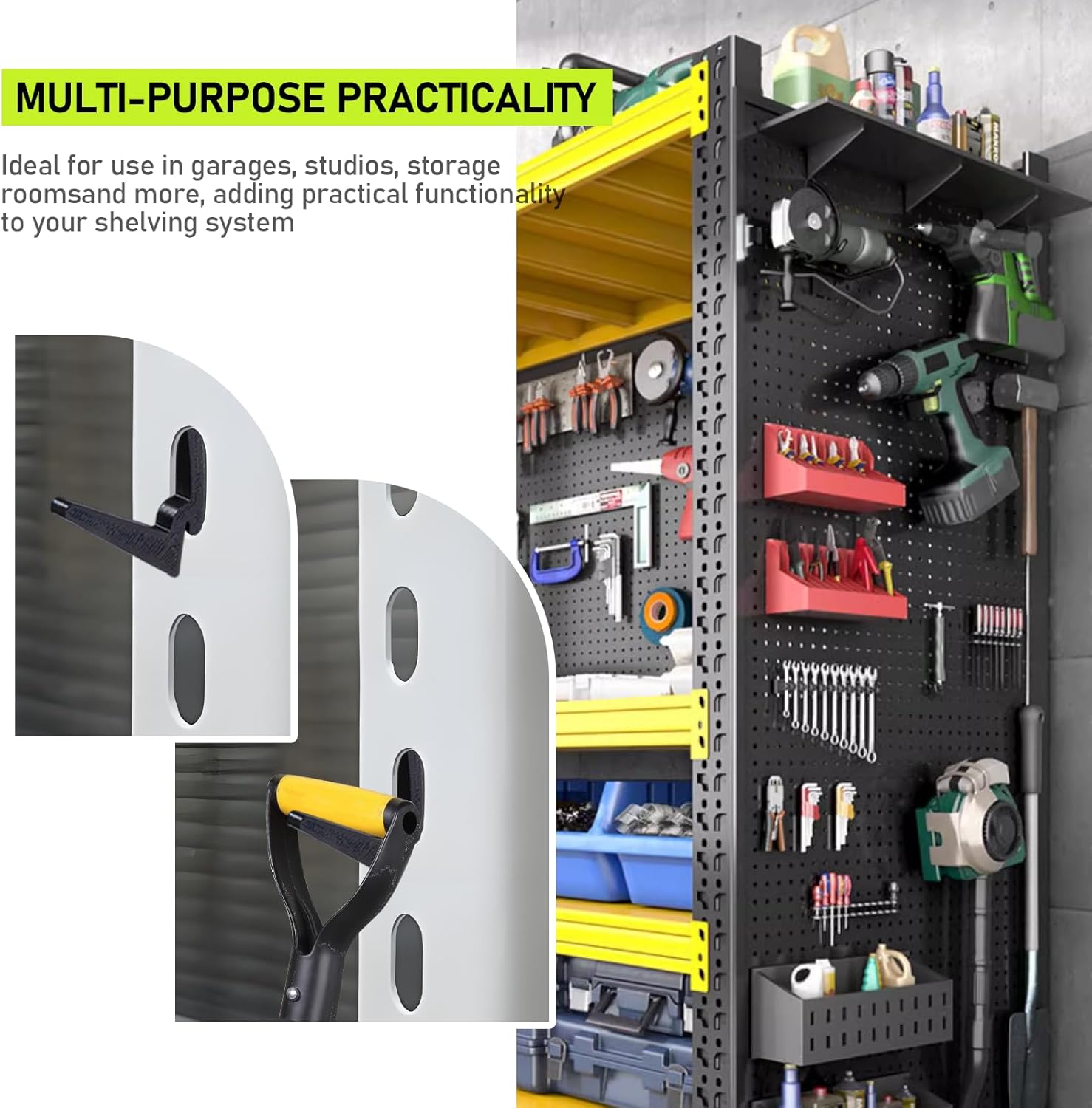 - MULTI-PURPOSE PRACTICALITY: very suitable for use in garages, studios, storage rooms and other places, adding practical functions to your shelf system.