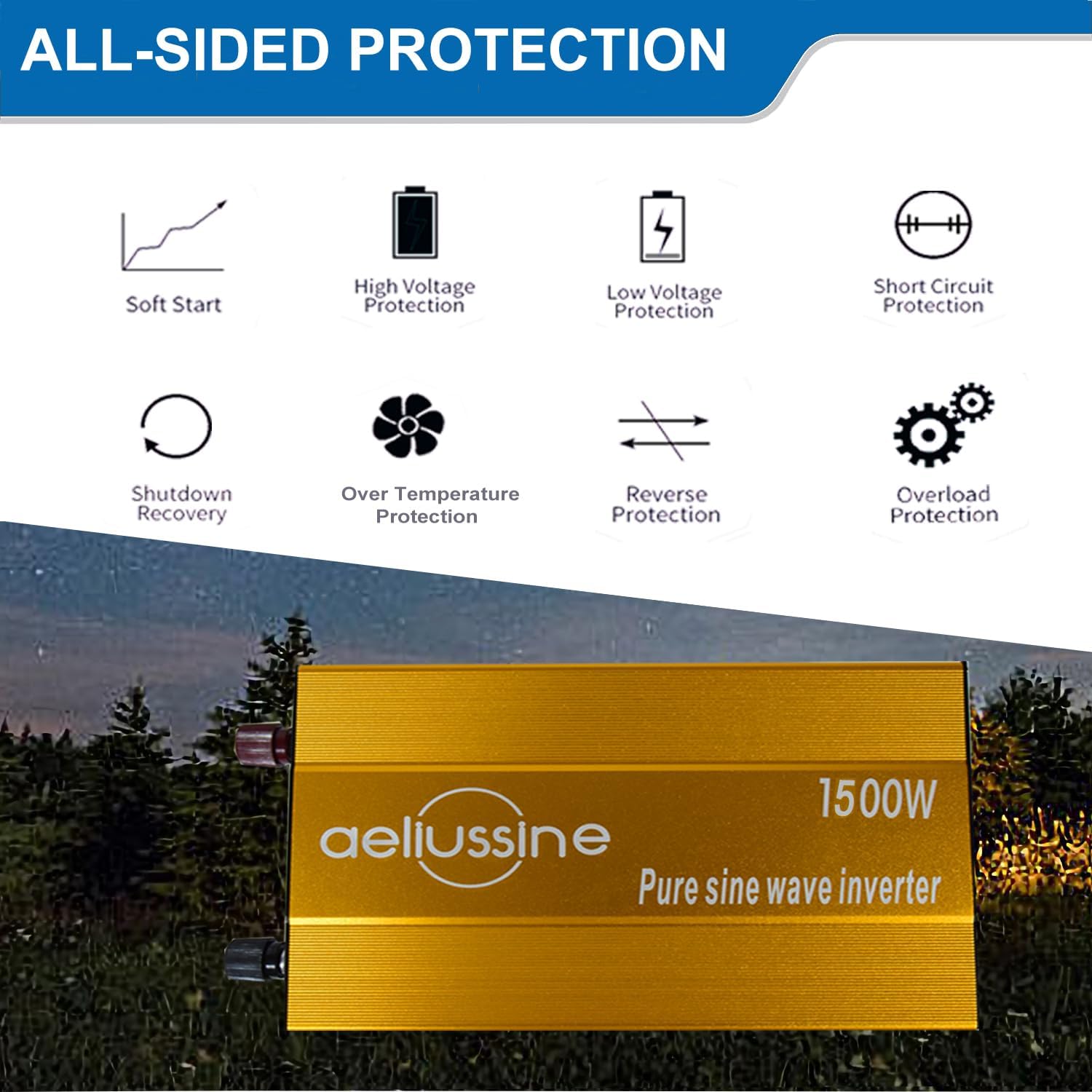 - 【Fully Safety Protections】The pure sine wave inverter has high efficiency and stable performance. It has sound protections including overload protection,over current protection, short circuit protection, battery reverse connection protection, high temperature protection, high or low battery input protection, built-in fuse protection.
