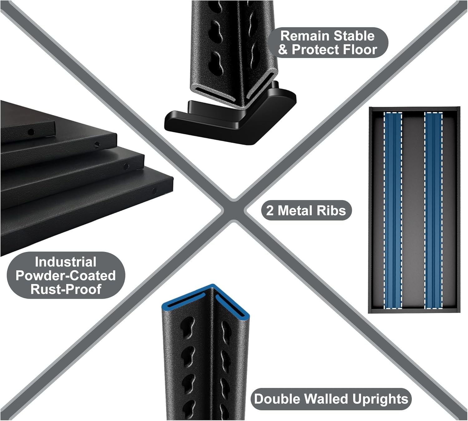 - 【Great Strength and Durability】The shelving unit is definitely an upgrade from the traditional wire shelves of the past.All metal shelves with bracing ribs and 1.2mm thickened metal uprights complete the unit with a total of 1500 lbs bearing capacity.No need to worry about overloading the shelves.