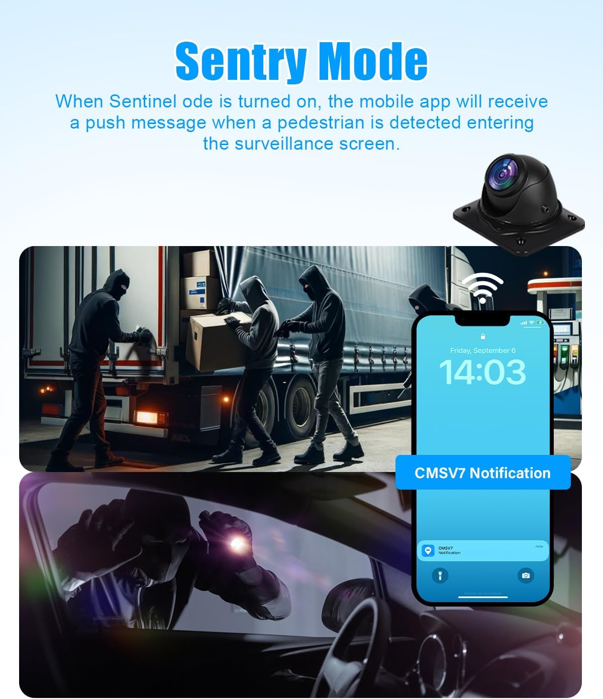 - 【Remote Monitoring with Sentry Mode】-- Activate sentry mode to receive instant alerts on your smartphone when someone enters the monitoring range, allowing you to remotely monitor and check the situation.