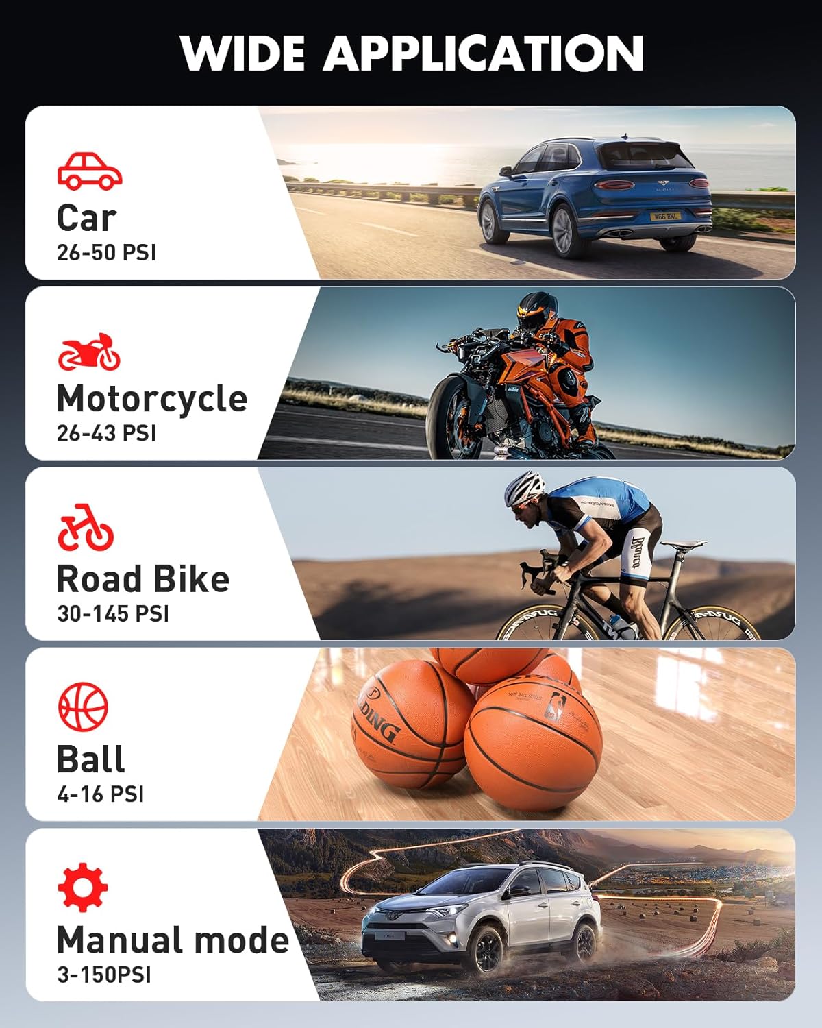 - 🚀【Power Portable Air Compressor】Povasee Tire Inflator equipped with a high-performance motor and advanced chip delivering 32L/min airflow at 150PSI! Furthermore,its pocket-sized design ensures ultimate portability for daily!