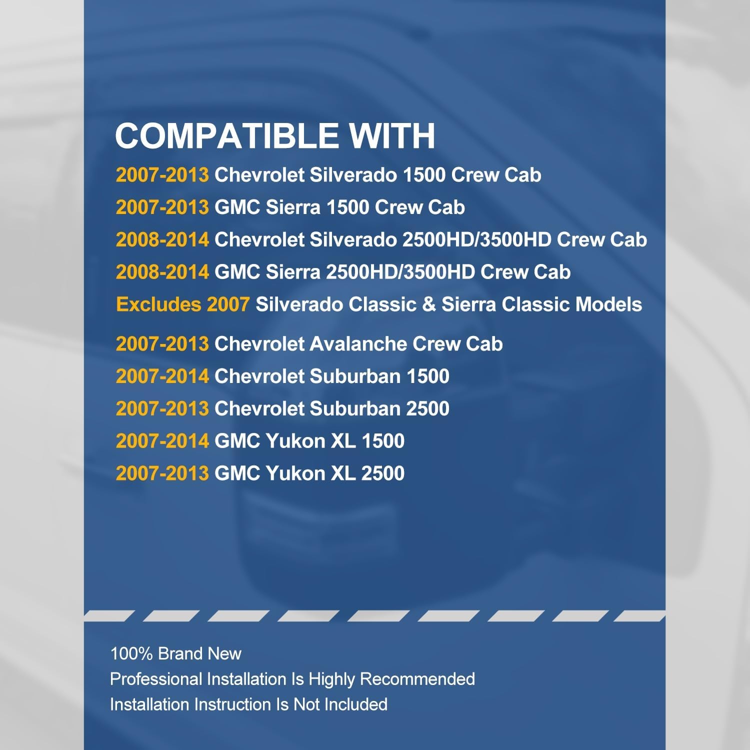 - Vehicle Compatibility - Window Visors Compatible with 2007-2013 Chevrolet Silverado 1500 & GMC Sierra 1500 Crew Cab;, 2008-2014 Chevrolet Silverado 2500HD/3500HD & GMC Sierra 2500HD/3500HD Crew Cab, Fits Model Excludes 2007 Silverado Classic & Sierra Classic Models, 2007-2013 Chevrolet Avalanche Crew Cab, 2007-2014 Chevrolet Suburban 1500, 2007-2013 Chevrolet Suburban 2500, 2007-2014 GMC Yukon XL 1500, 2007-2013 GMC Yukon XL 2500