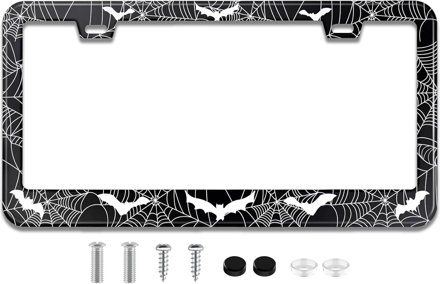License Plate Frame for Bats and Spider Webs Stainless Steel License Plate Frames Holder Covers Rust-Proof Auto Parts Decoration with Screws License Plate Holder for Car Accessories 12x6 Inch