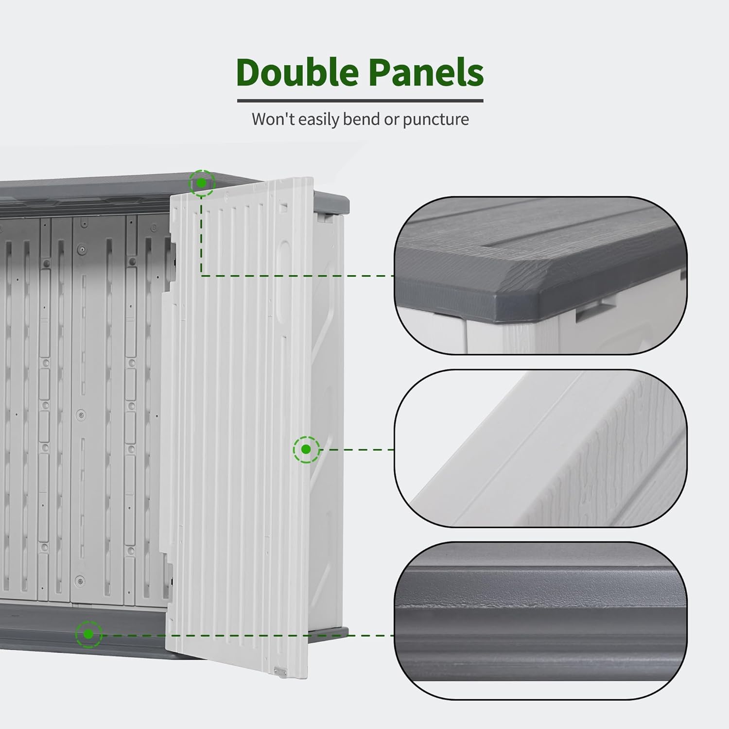 - Double Panels: The shed outdoor storage features double panels that won't easily bend or puncture