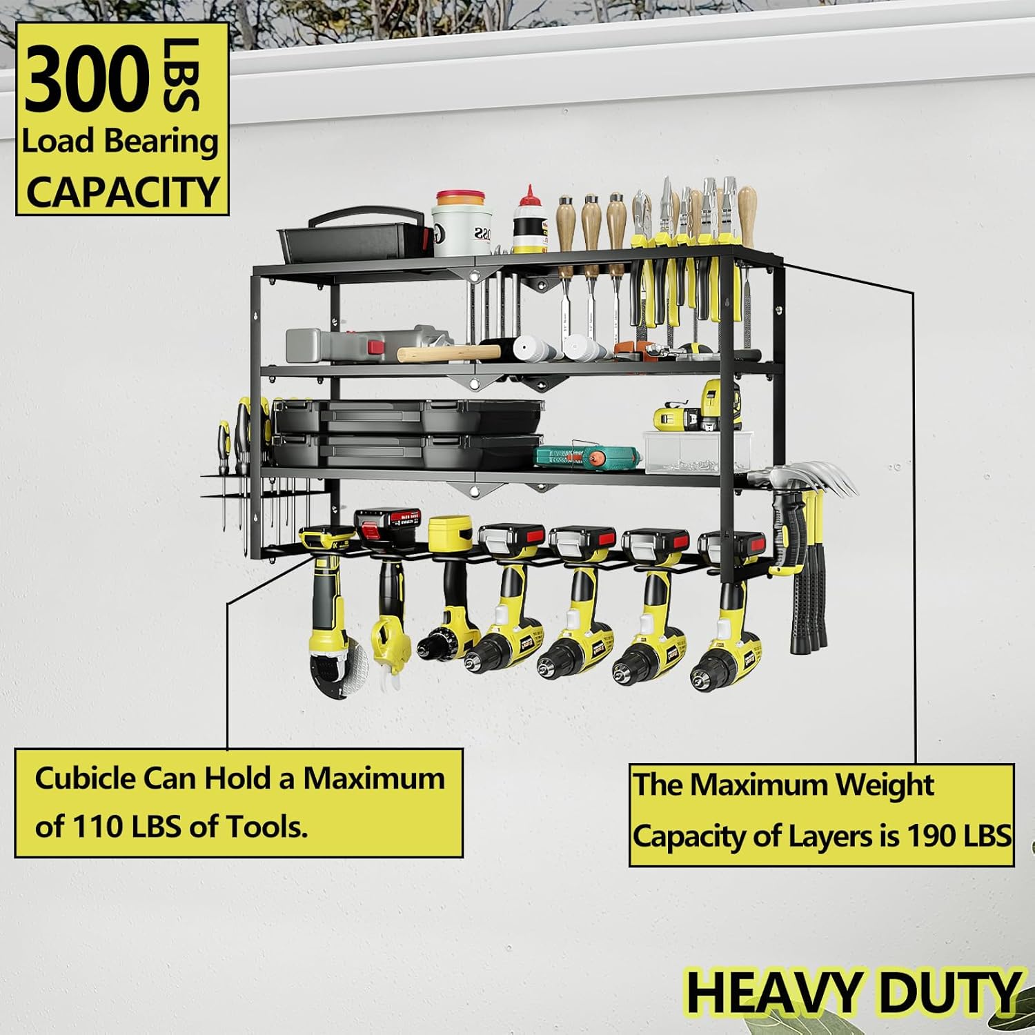 - Durable: This 4-layer tool storage rack is made of high-strength compact metal, with stronger load-bearing capacity and durability. Our tool storage rack has been extensively tested to bear up to 300 pounds.