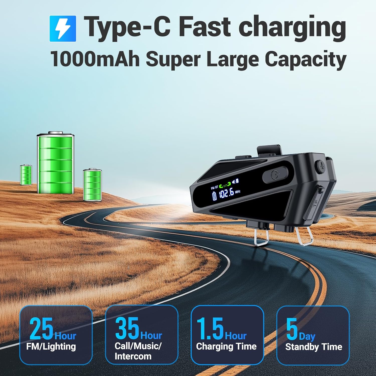 - 1000 mAh Longer Battery Life: C6 Bluetooth helmet speakers With an 1000mAh lithium-ion battery and USB-C fast charging, 25 hours of FM/lighting, 32-35 hours of music/call/intercom, 120 hours of standby, and the helmet headset takes only 1.5 hours to fully charge, ensuring that you'll have continuous use throughout the day.
