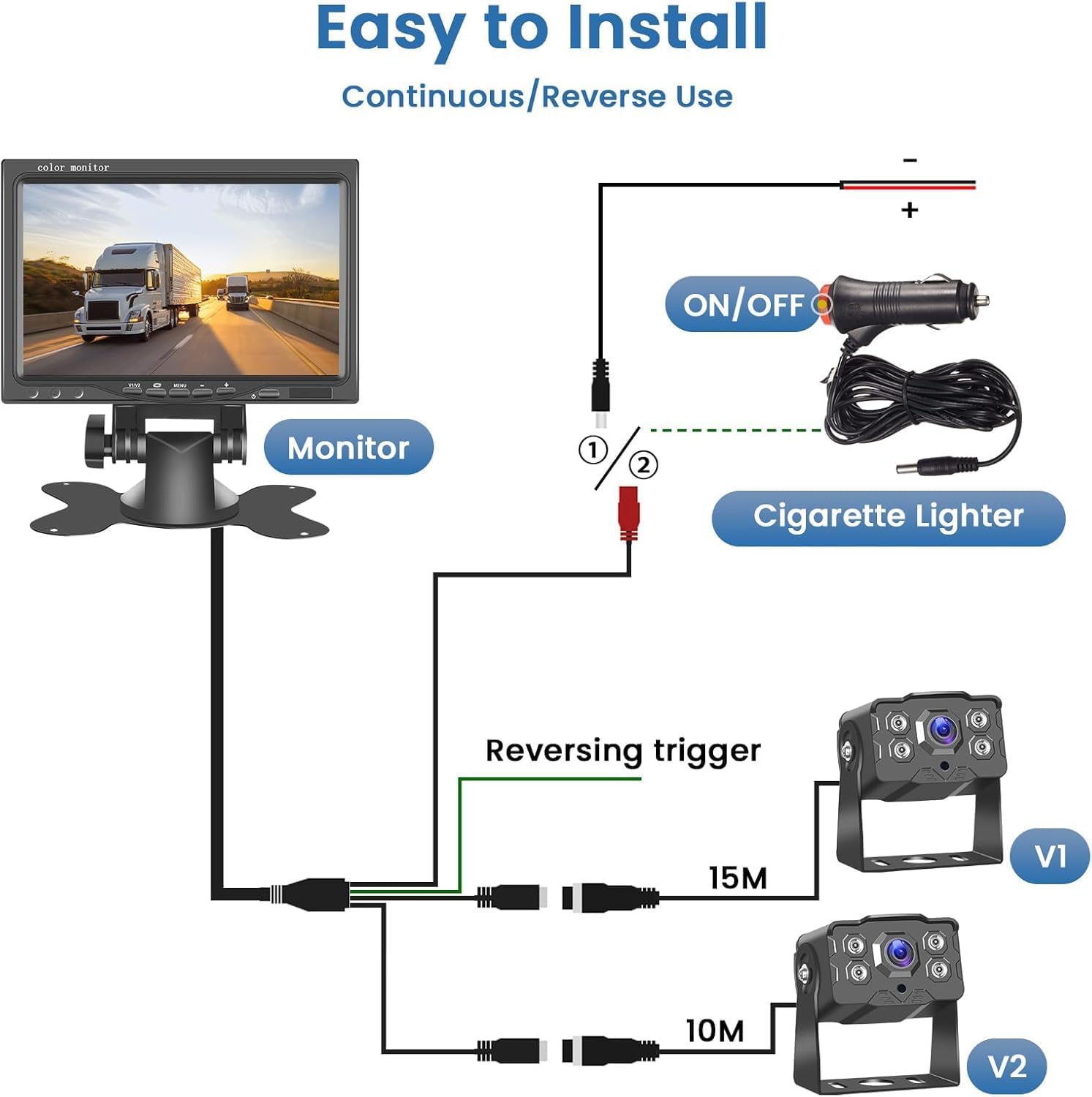 - Dual Channel: The 7-inch AHD monitor supports two video inputs (V1/V2), allowing for additional cameras like a standard or license plate camera. The V2 input has priority for safety