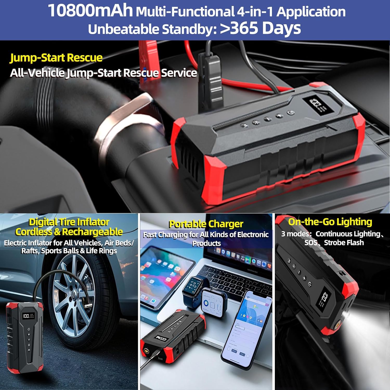 10800mAh Car Jump Starter with Air Compressor and USB/Type-C Charger, UL-Certified Portable Power Station for Cars