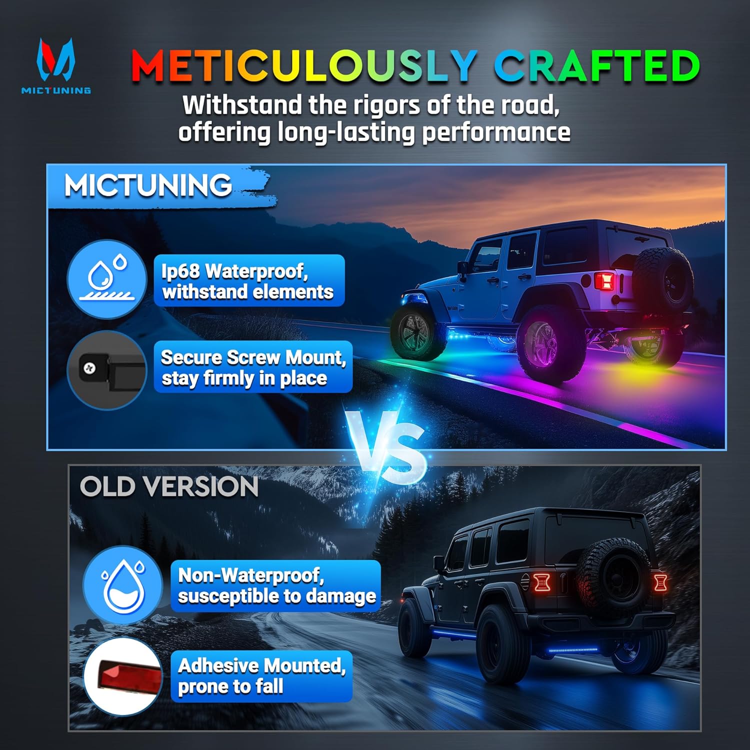 - 【Aluminum Alloy Light Bars】 - Unlike traditional flexible strips, these rigid aluminum alloy light bars provide sturdy, secure mounting under your car. The tough housing ensures quick heat dissipation and protects LED strips from damage, extending the lifespan of your lights