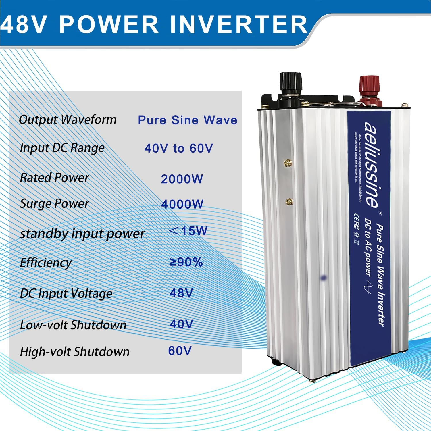 - pure sine wave inverter:Smooth and perfect sine waveform, just the same as home power/city power, Provide max 2000 watt continuous power and 4000 watt peak power at 60Hz frequency, power your 110v 120v ac appliance with a 48v power battery bank (battery voltage 40v to 60v is acceptable)