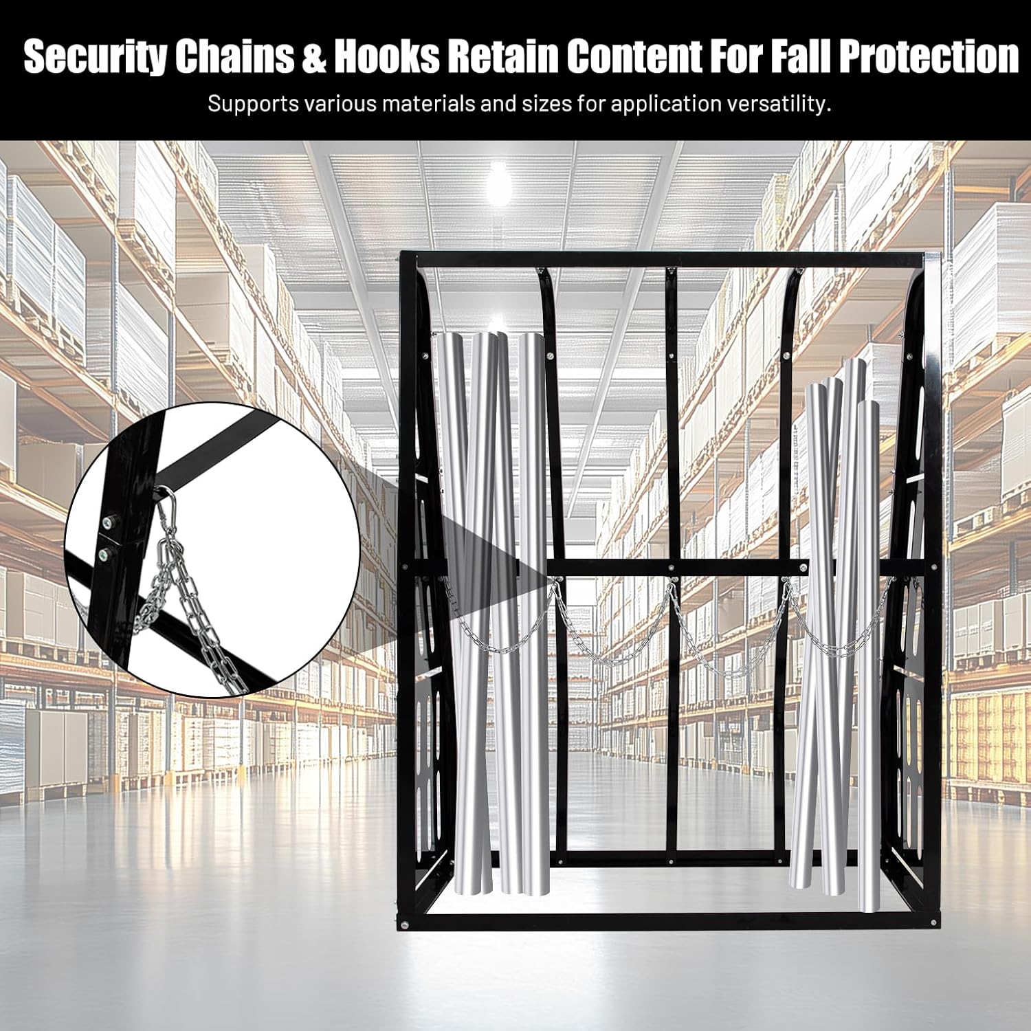 - Secured In Place With Chains: Each rack station includes a pre drilled chain slot to create a barrier against any resources that may tip or slide out of position. Materials are stored upright in the bays, and can be secured using the included galvanized chains, connected with snap hooks