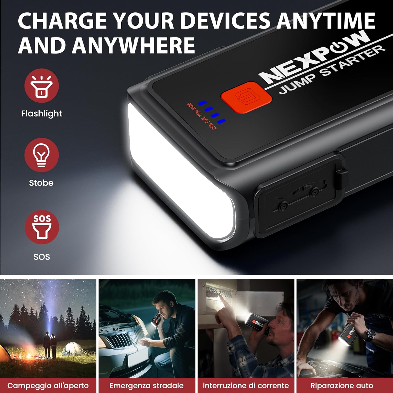 - MULTIFUNCTIONAL & CONVENIENT: More than just a jump starter, Q2 jumper box also functions as a power bank to charge your devices, designed with USB output(5V/2.4A), can fully charge your cellphones, earphone and other mobile devices. Featuring a built-in LED flashlight with 3 modes ( flashlight, strobe, and SOS) for nighttime emergencies and outdoor adventures.