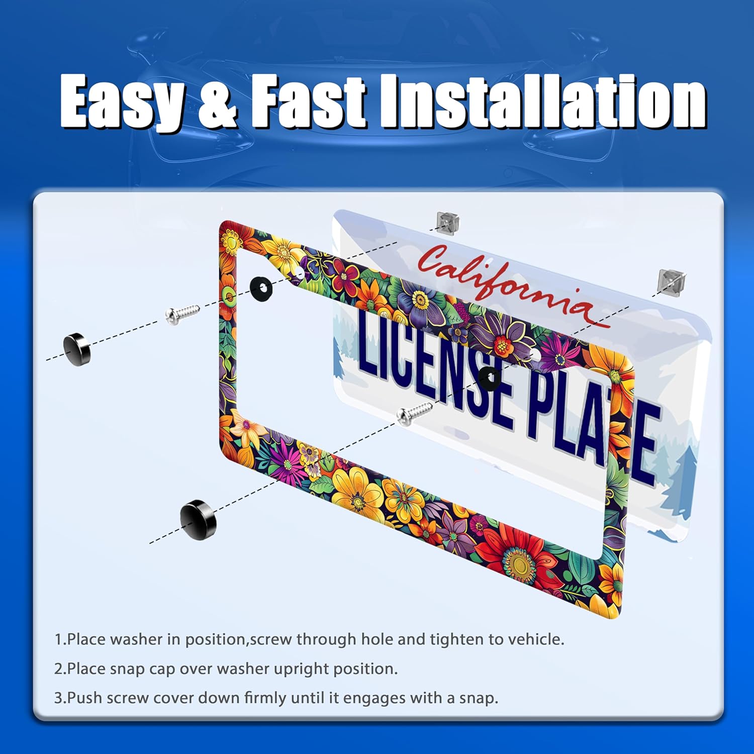 Bright Flowers Colorful Floral License Plate Frame Flower License Plate Stainless Steel Funny License Plate Holder for Women Cute Car Accessory Decoration 12.3" x 6.3"