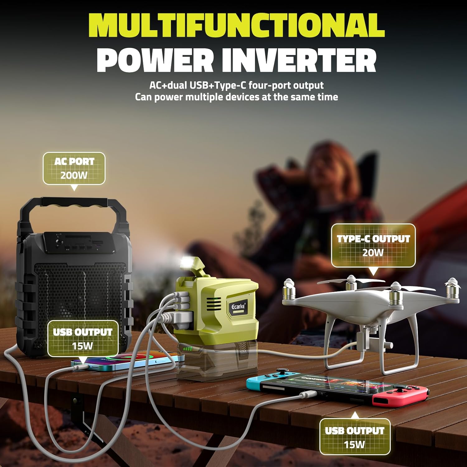 200W Portable Power Inverter Compatible with Ryobi 18V,Ecarke Outdoor Generato Battery Converter with 2 USB&LED&AC Battery Powered Outlet,Convert DC 18V/20V to AC 110V-120V Portable Power Station