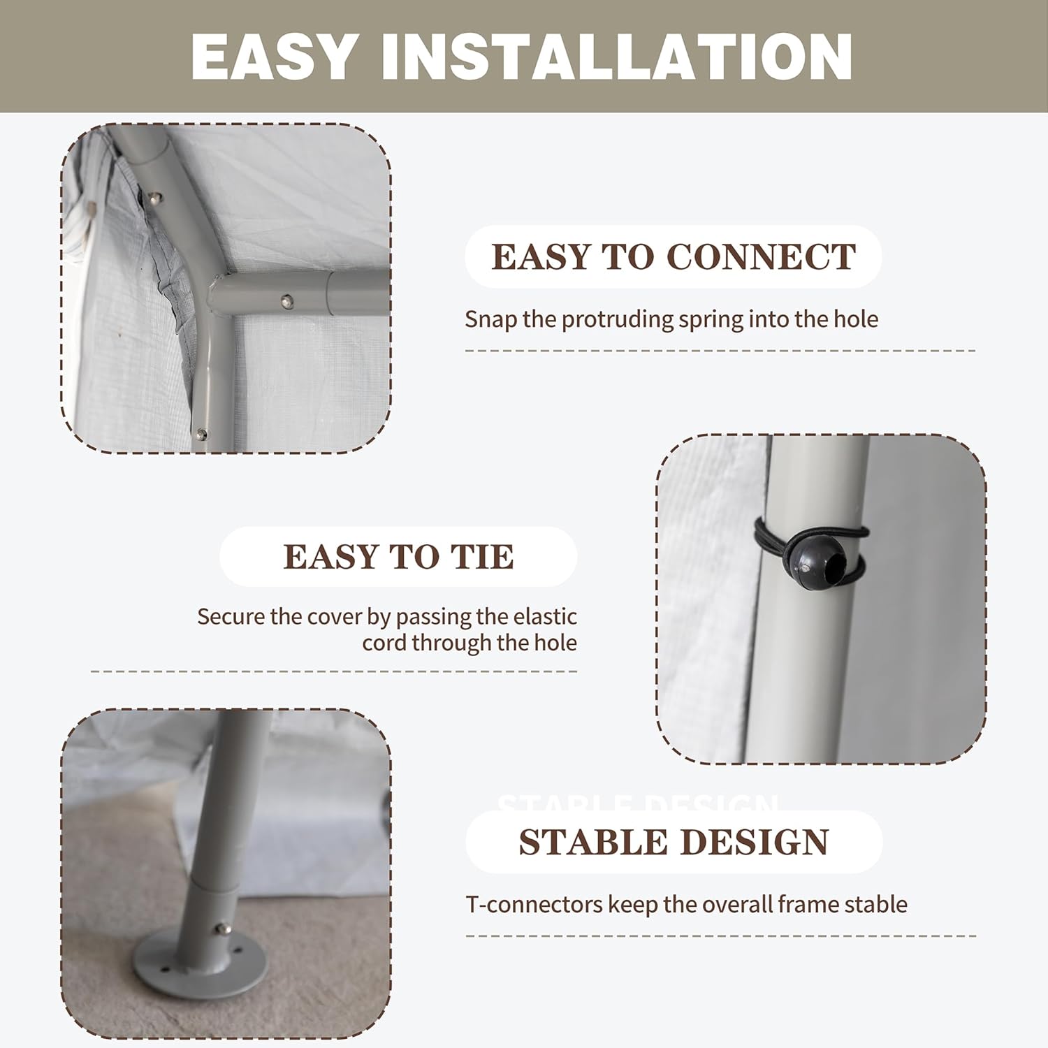 - Roll-up Zipper Door:Doors with double zippers and buckles can be removed or rolled up. The front and rear of the storage shed are equipped with doors for easy access, better visibility and easy air circulation.