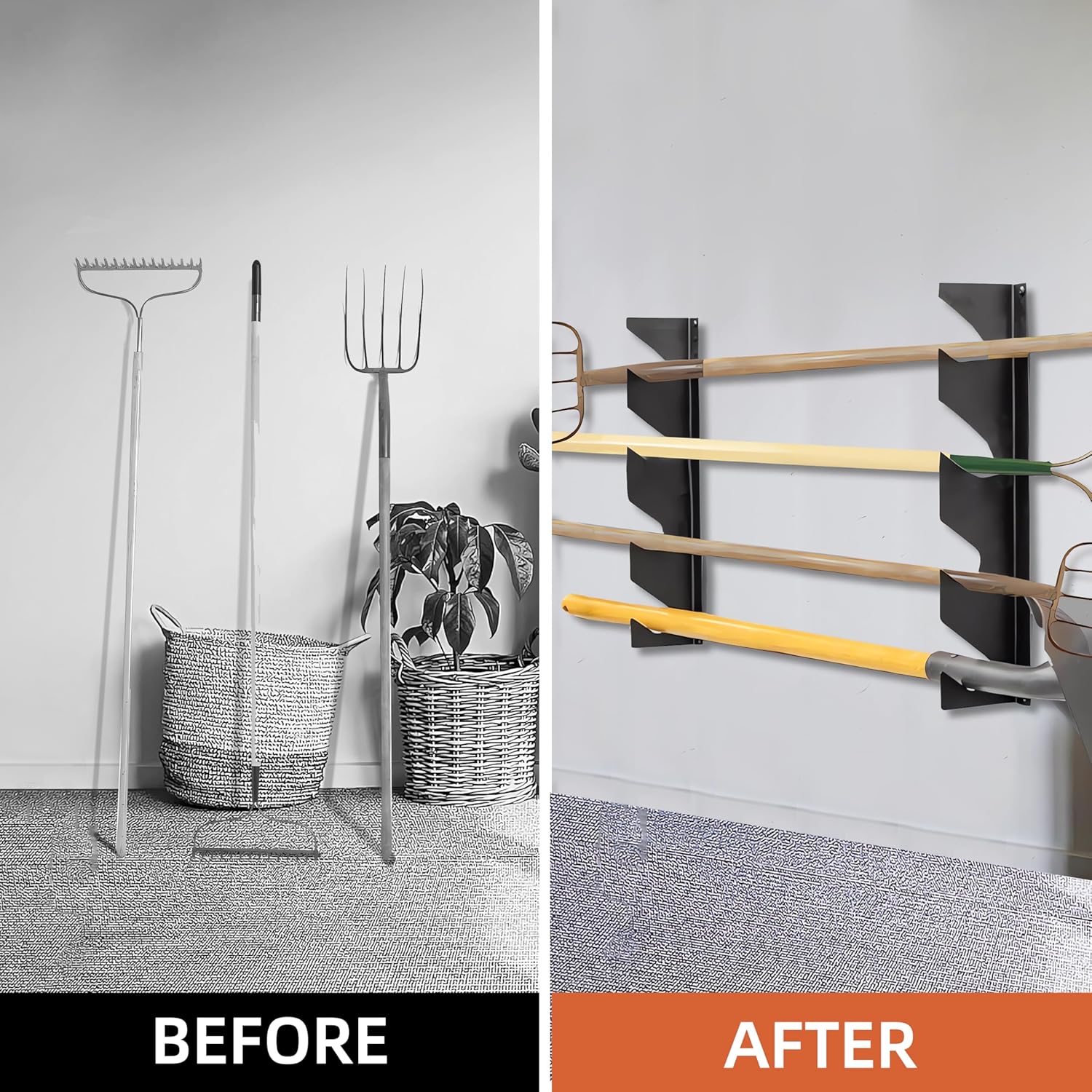 • Maximize Space with the Garage Tool Organizer Wall Mount:Transform your cluttered garage or shed into an organized space with this Garden Tool Organizer. Measuring 17.5" L x 4" W x 1" H, it securely holds shovels, rakes, brooms, and other long-handled tools, keeping them off the ground and easily accessible. Perfect for garages, workshops, and utility rooms