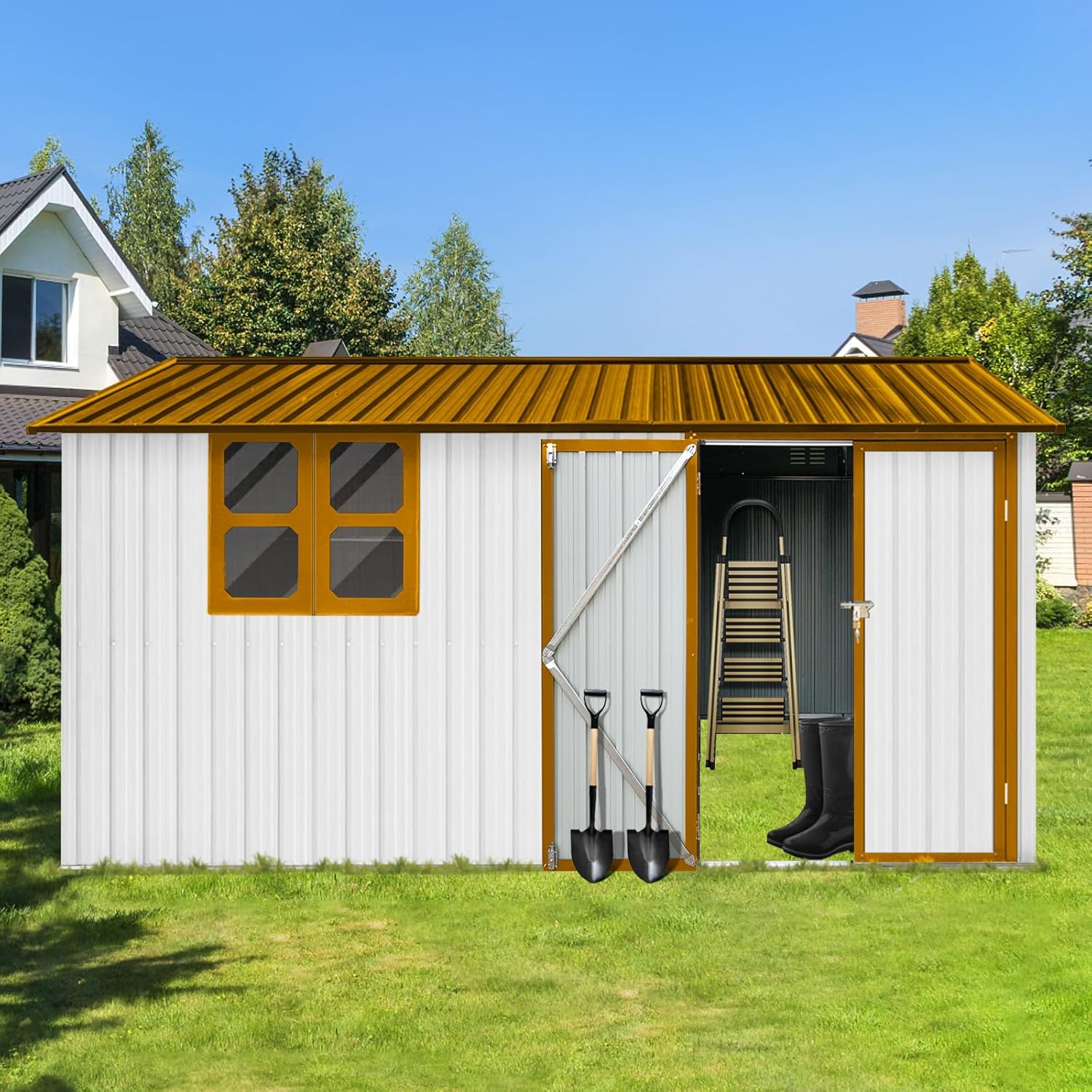 10x12 FT Outdoor Storage Shed, Large Metal Garden Shed with 4-pane Window, Outside Tool Shed with Lockable Hinged Door & 4 Air Vent, Waterproof Storage Building for Backyard, Patio, Lawn, White+Yellow