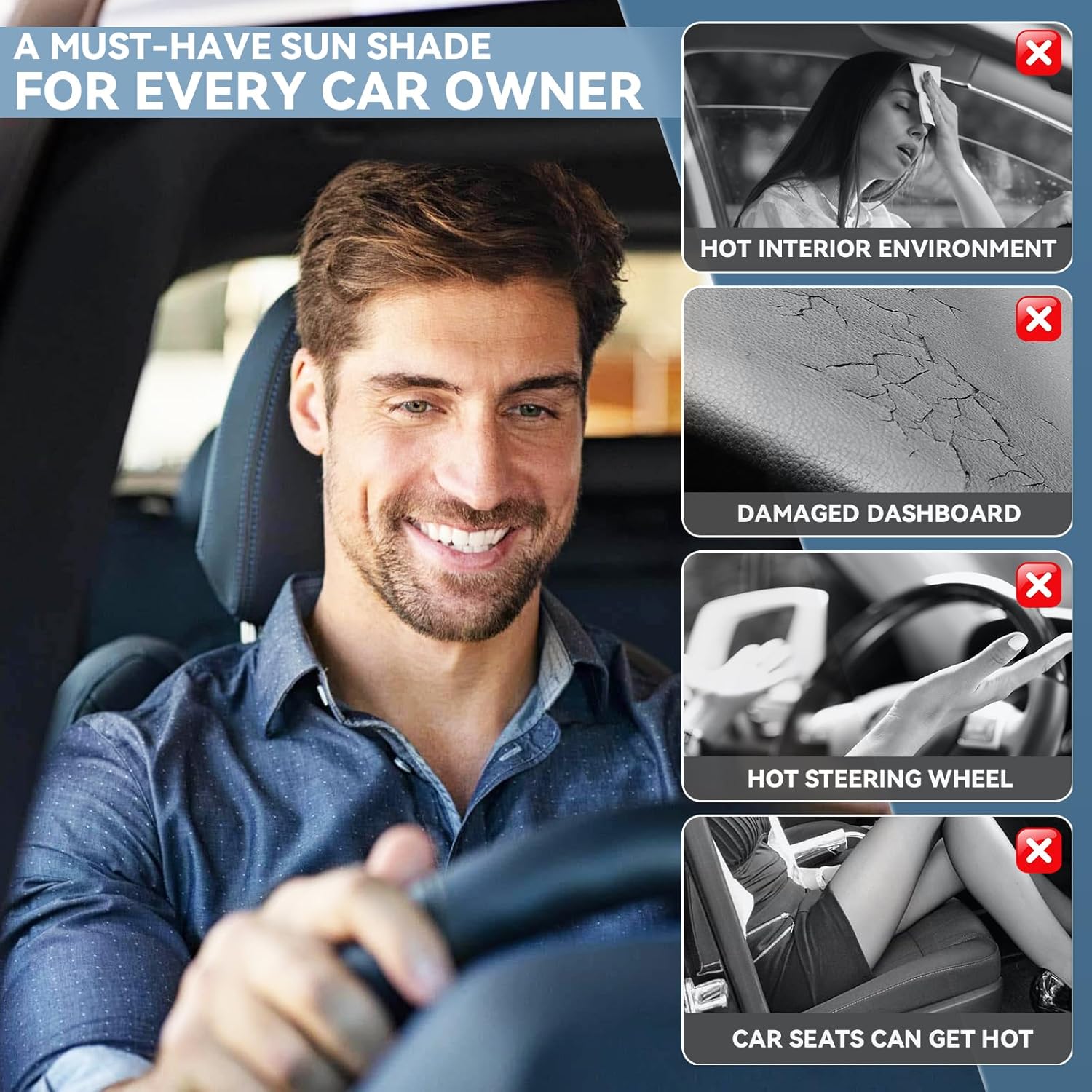 - 【SAVE YOUR CAR’S INTERIOR】This sun visor cover is specifically designed to keep your vehicle’s interior cool, preventing fabrics, leathers,screen and other parts from heat or sun damage.2 in 1 function,Not only can it protect car interior, but also it can make the car cooler.