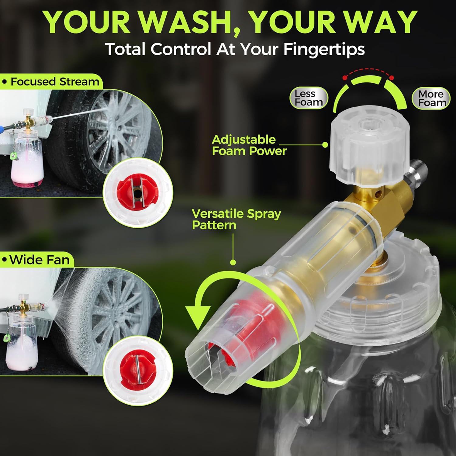 - 🚗✨𝗧𝗮𝗶𝗹𝗼𝗿𝗲𝗱 𝗙𝗼𝗮𝗺 𝗠𝗮𝘀𝘁𝗲𝗿𝘆-- Take full control with dual-adjustment features: The rotating nozzle switches from wide fan to targeted stream, while the foam knob lets you dial in car wash foam gun precision—thick suds for muddy trucks or light mist for delicate paint. This foam cannon adapts like a pro-grade tool for every wash scenario.