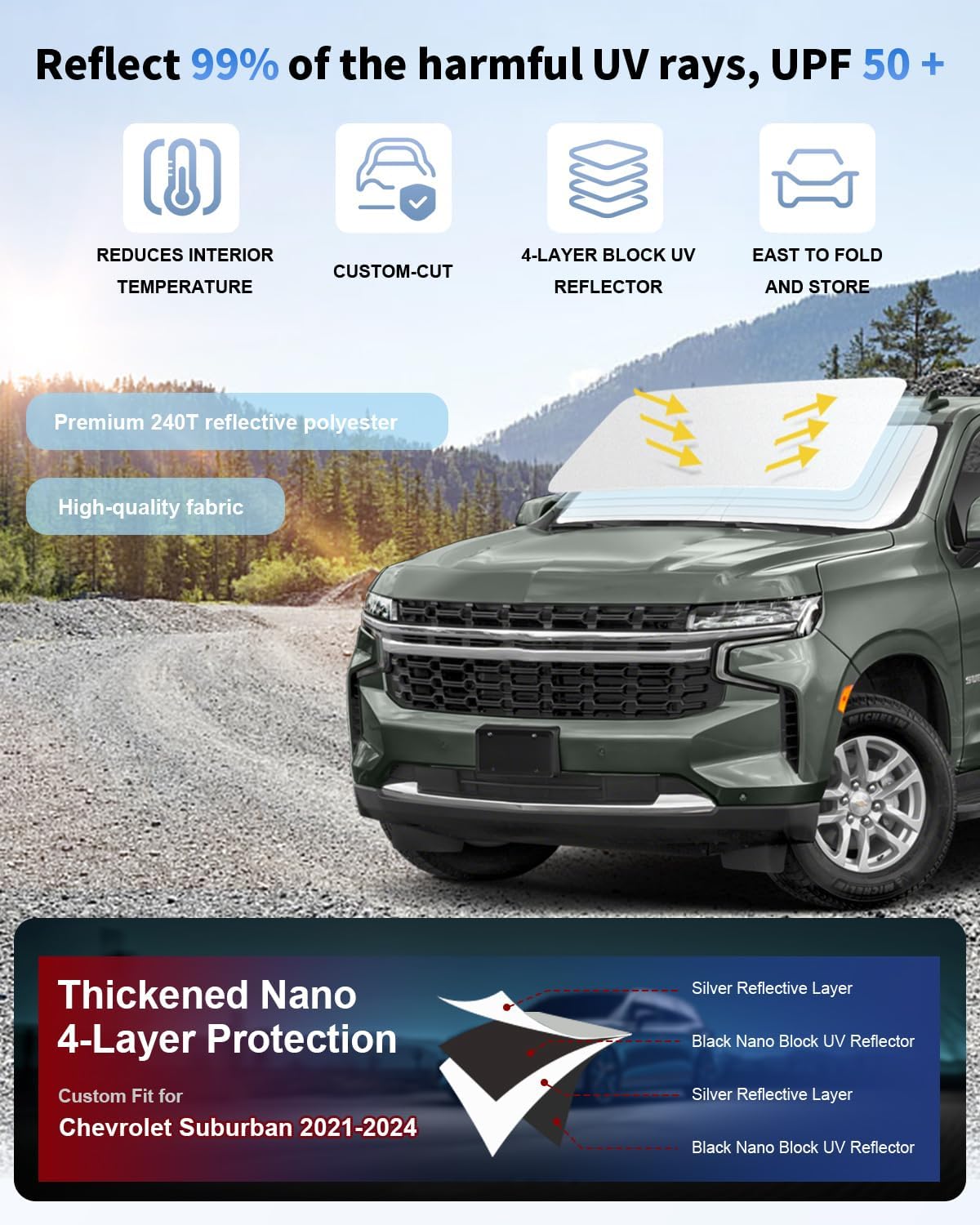 - [VEHICLE SPECIFIC] SLOGENTO Windshield Shade for 2021- 2023 2024 2025 Chevrolet Chevy Suburban Accessories ,Full covered your windshield,No Gap,100% Perfect fit.