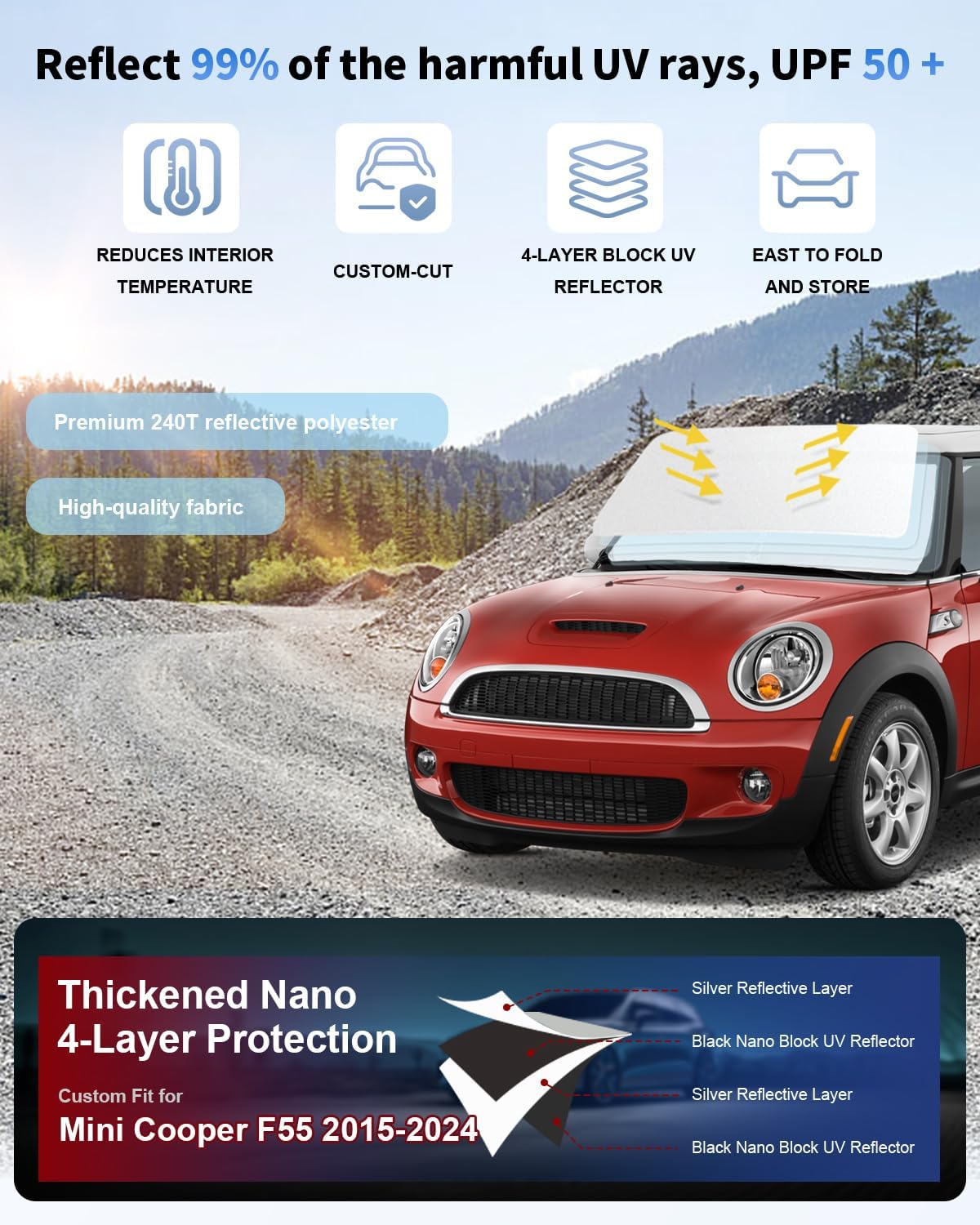 - Vehicle Service Type fit for 2015-2023 2024 2025 BMW Mini Cooper F55 : Material Insulation layer and silver 240T reflective polyester fibre Insulation layer and silver 240T reflective polyester fibre See more