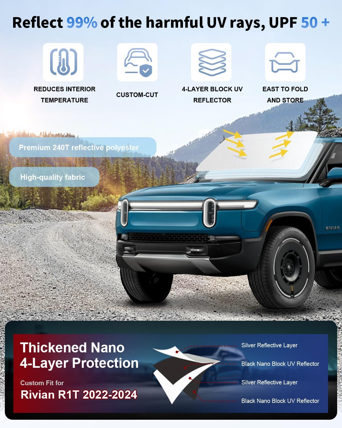 - [VEHICLE SPECIFIC] SLOGENTO Windshield Shade custom fit Custom Fit for 2022 2023 2024 2025 Rivian R1T, Full covered your windshield,No Gap,100% Perfect fit.