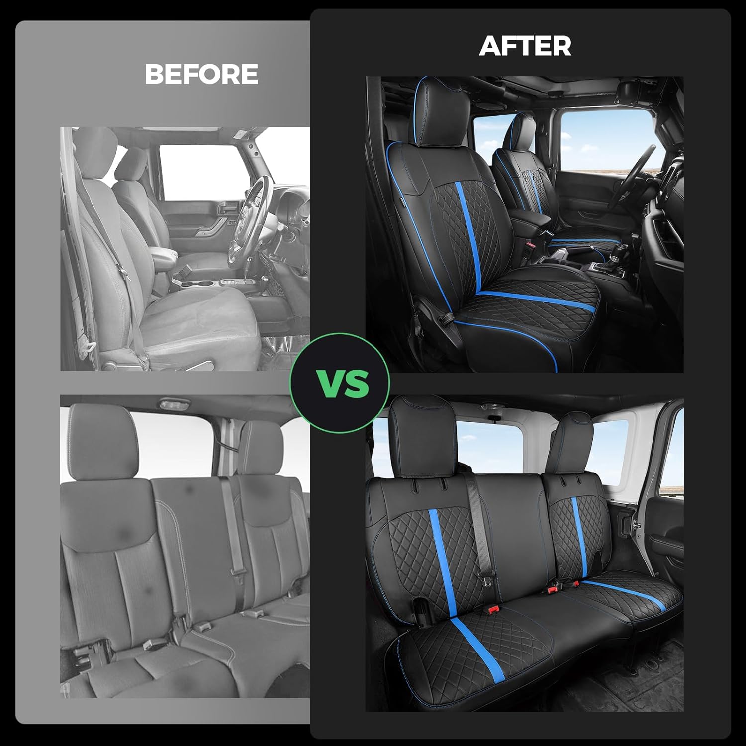for Jeep Wrangler Seat Covers 4Door JK 2013 2014 2015 2016 2017, Custom Car Seat Cover Full Set, Luxury Leather Seat Protectors, Waterproof SUV Interior Cushions Accessories, Black Blue Trim