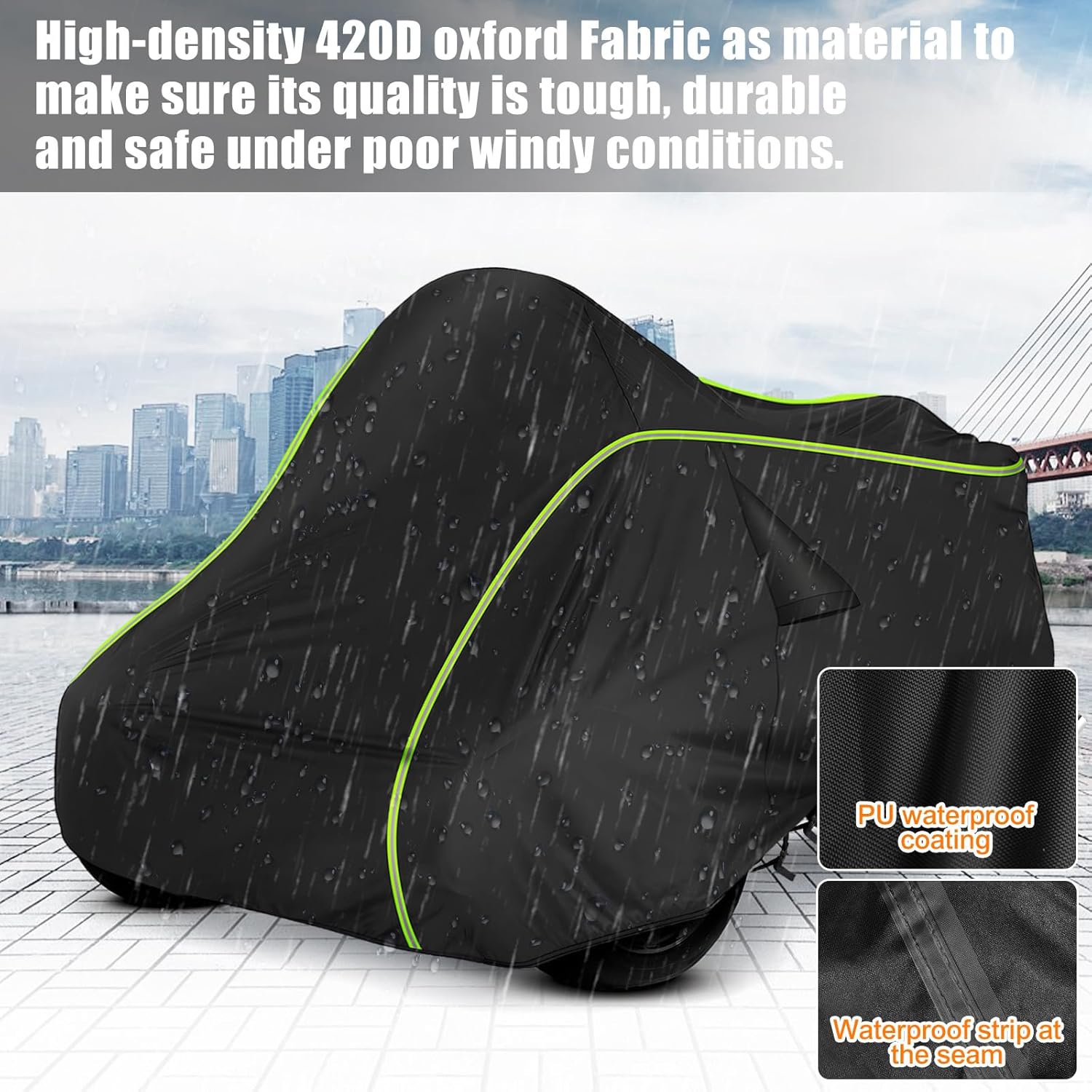 - 【All-Weather Protection】Take High-density 420D oxford cloth as material can withstand 5000 Pa water pressure to make sure its quality is tough, sturdy and safe under poor windy conditions. Prefect for all weathers and seasons. Preserve your Vehicle and Paint Against All Rain, Snow, Sun, Bird Droppings, Dust/Dirt - Approved for All Season Use (Spring, Summer, Fall, Winter).