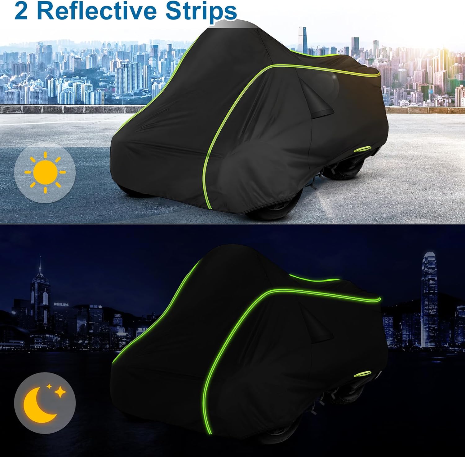 - 【Distinct Designs】(1)* Black pu Coating: UV protection and heat-proof, prevent cracking and aging of inner decoration leather and plastic. (2)*Two Reflective Strips surrounding the whole body of the vehicle to prevent collisions during the night and make your car more recognizable (3) *It comes with a windproof buckle , a “FRONT” sign,two air Vents and a draw string storage bag. (4)*A velcro opening for antennal directions.(5)*Double-stitched & Waterproof Strip.