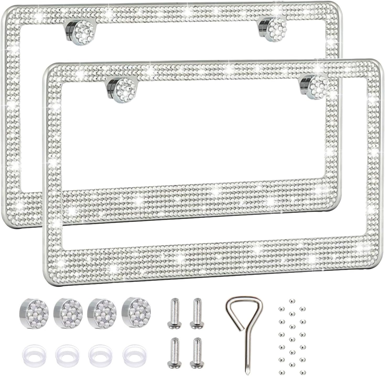2 Pack License Plate Frames for Women, Sparkly Rhinestone Diamond Car Accessories with Glitter Crystal Caps (White (2PCS))
