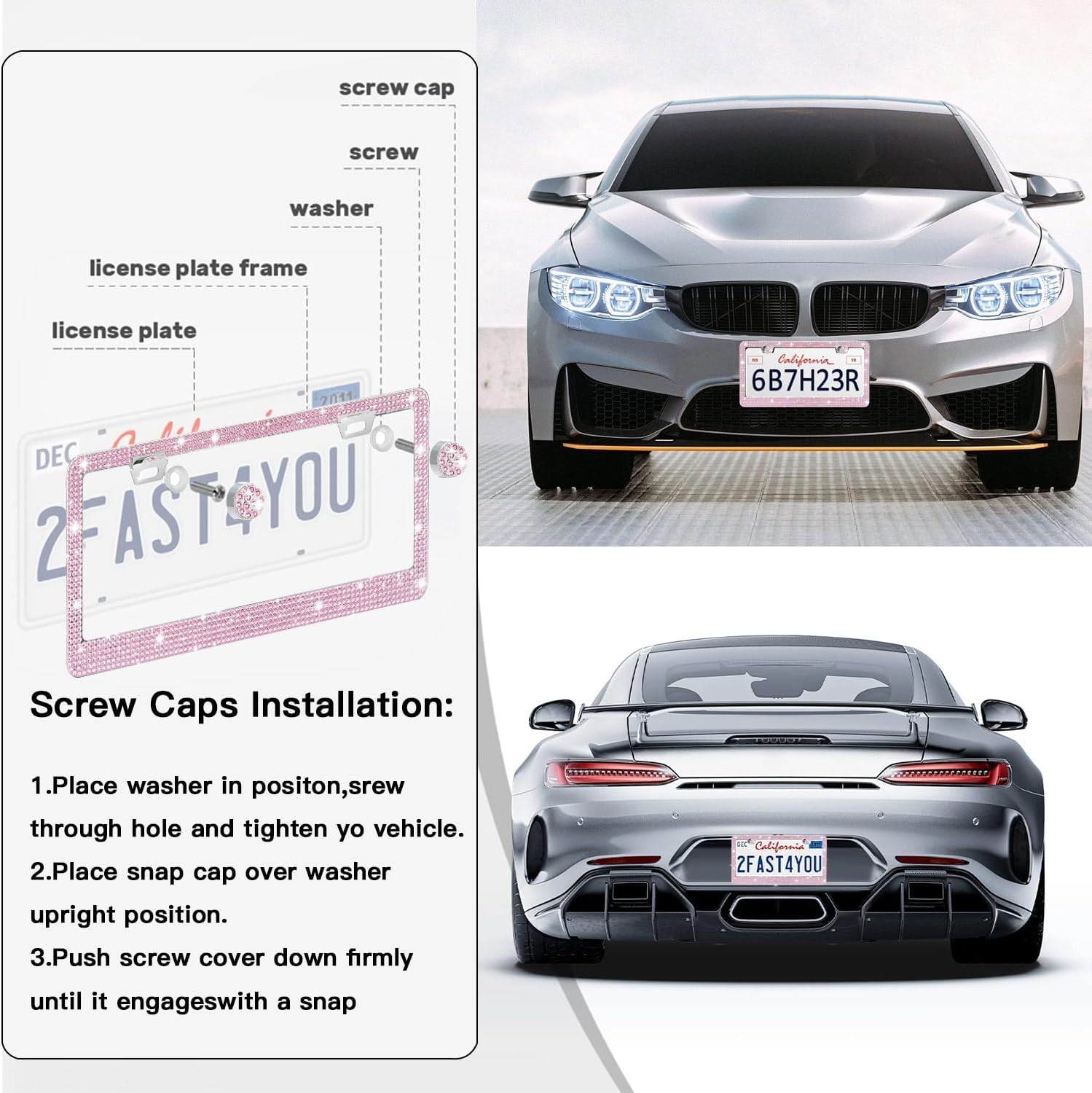 - 【Super Sparkly License Plate Frames】: Why go for boring plain license plate frames when you can go super fab with a car plate frame with actual rhinestones in it? Give your car a new cool look now! 2 Pack license plate frames for women are sure to make your car catch everyone’s eyes on the road