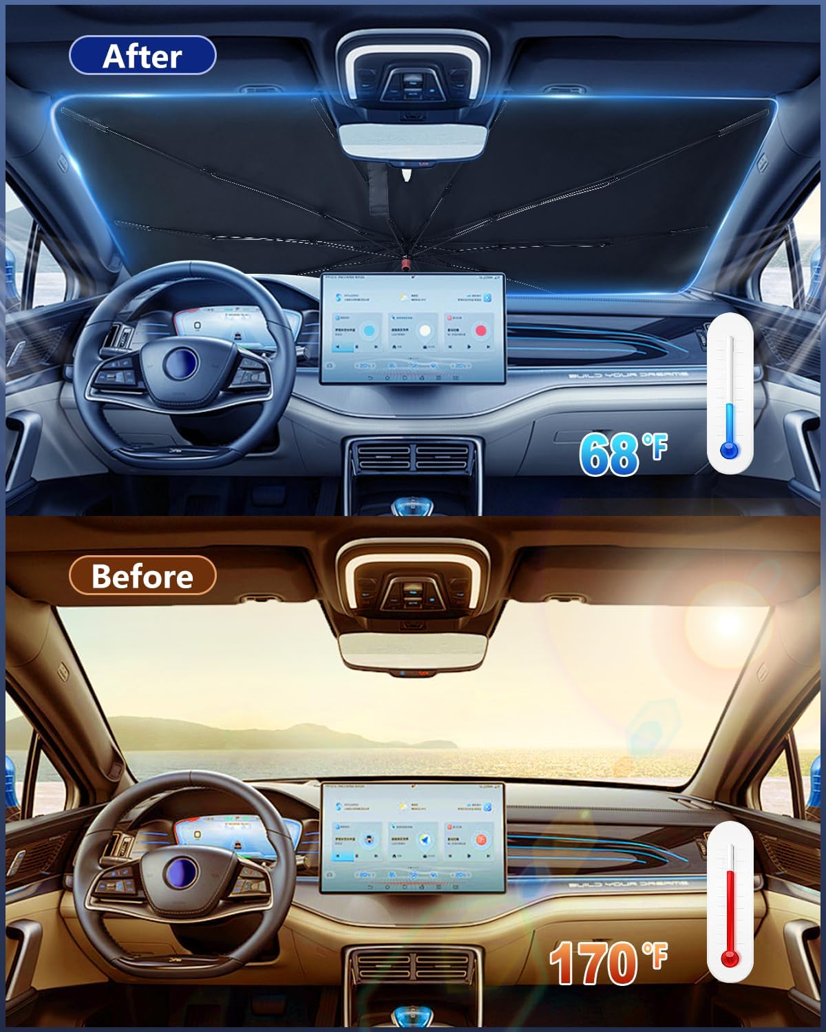 - 【10-Rib Fiberglass Frame】Built with military-grade materials and high-density fabric, this upgraded sunshade is highly durable and tear-resistant. Featuring 10 high-toughness fiberglass ribs, it ensures enhanced stability without cracking while remaining lightweight.